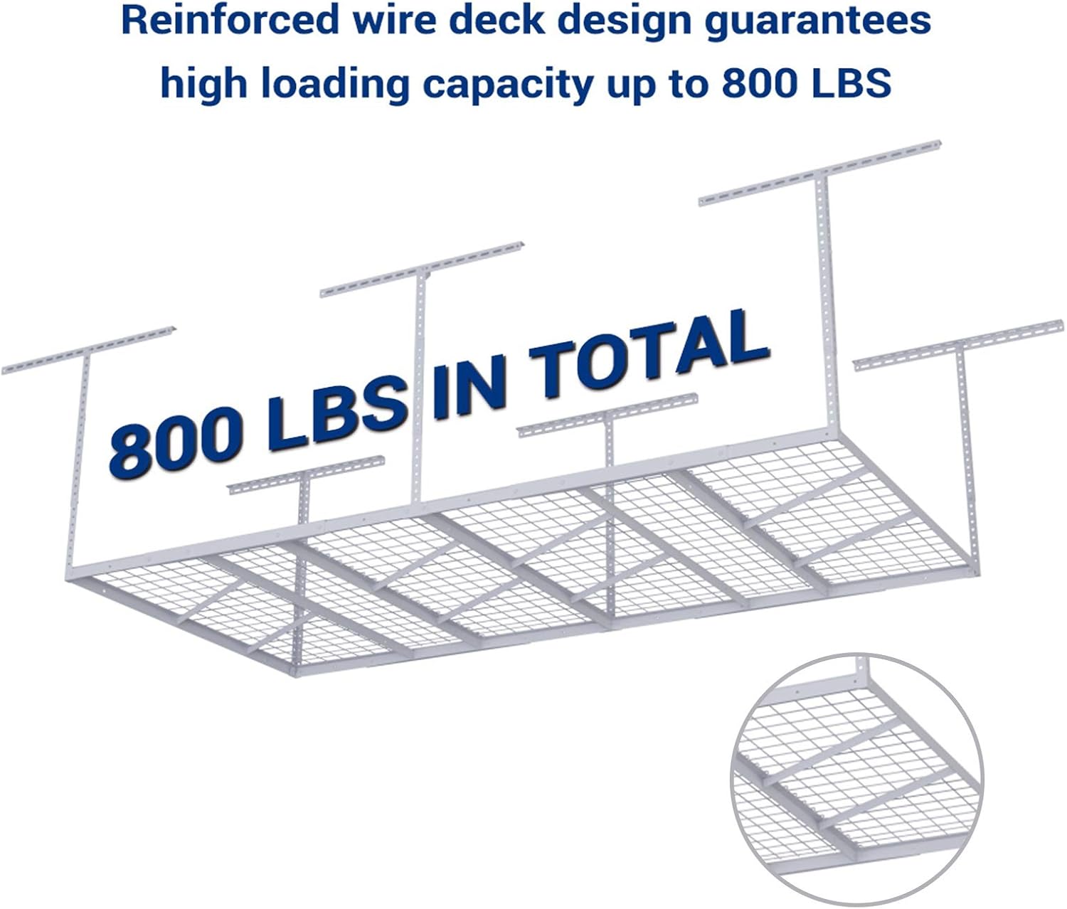 - 1600 lbs Tested, 800 lbs Rated: Our overhead garage storage rack undergoes rigorous double load testing (1600 lbs) to ensure unmatched safety and durability, supporting up to 800 lbs for your tools and equipment.