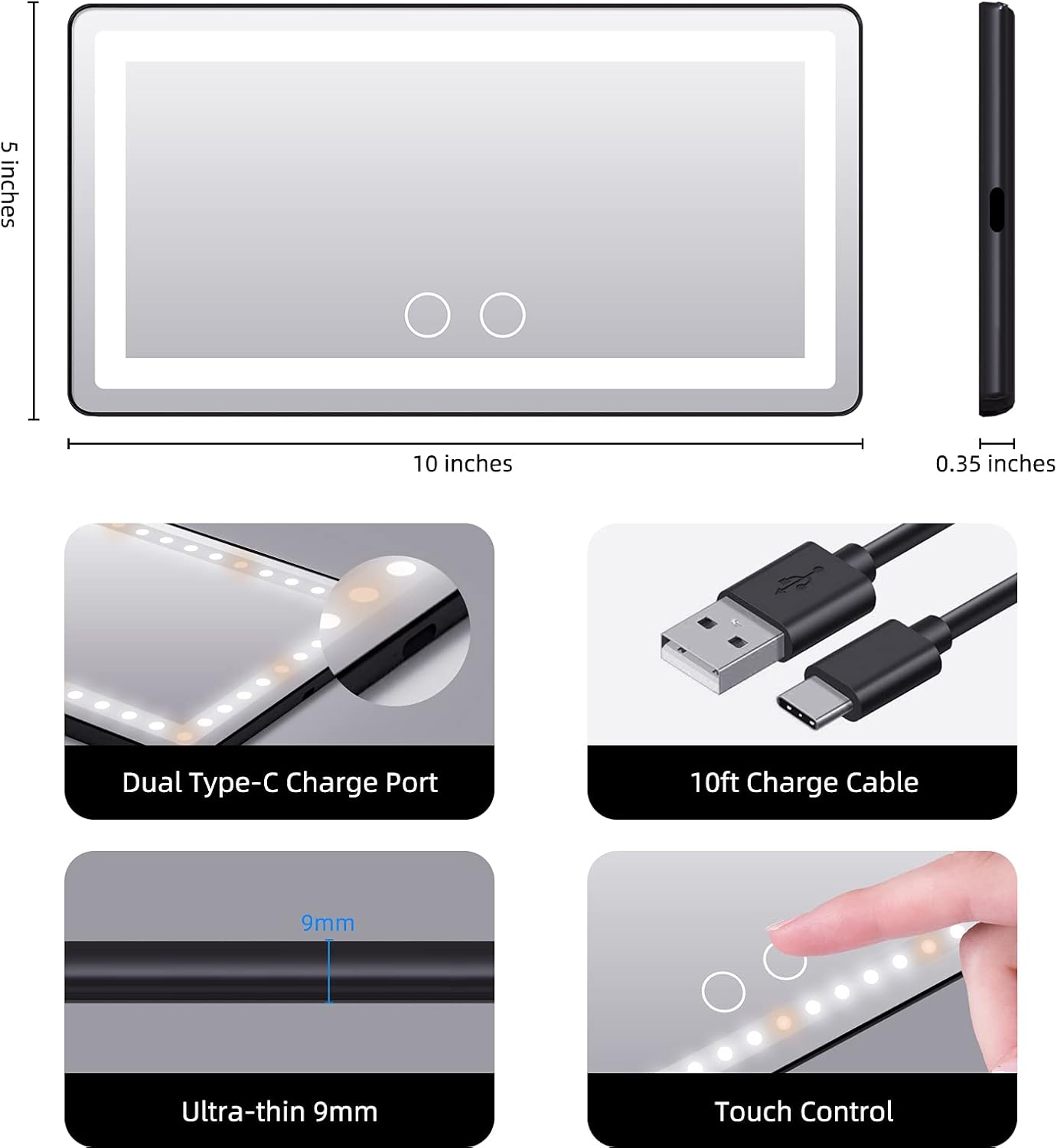 - Included Components : 1 x Car Makeup Visor Mirror with Light, 1 x USB charging Cable, 1 x User Manual, 2 x Straps