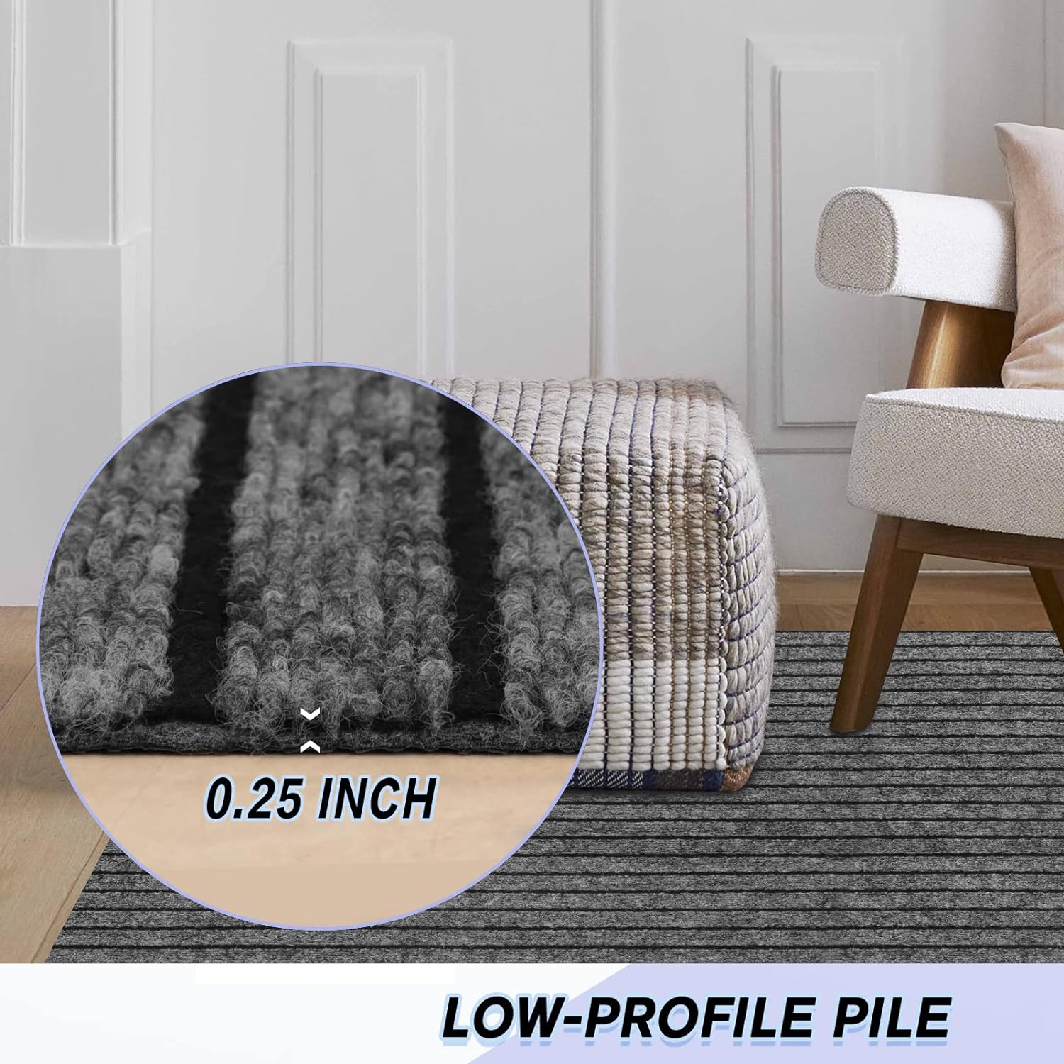 - Low Profile Design: The carpet heigh is 0.25 inch-Stripe Rug, 0.25 inch-Grid Rug and 0.35 inch-Monocolor Rug. Does not add bulk to your floor and allow for perfect placement under furniture and doors as well as on stairs, any high traffic area, indoors or outdoors.