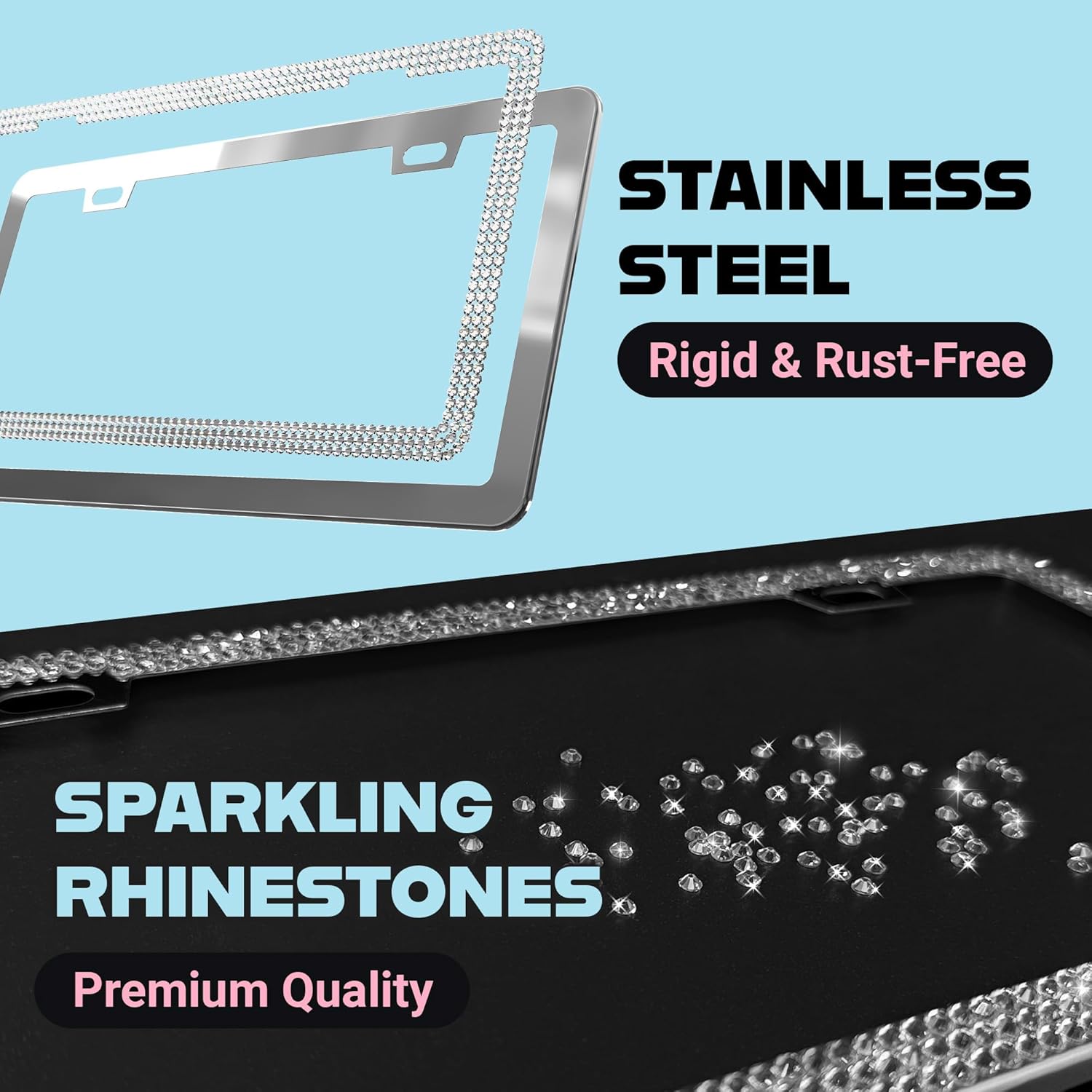 - Glitter Bling Rhinestone License Plate Frames for Women: Add a cute, girly, glittery touch to your ride with this stunning 2-pack licence plate frame that’s made to shine.