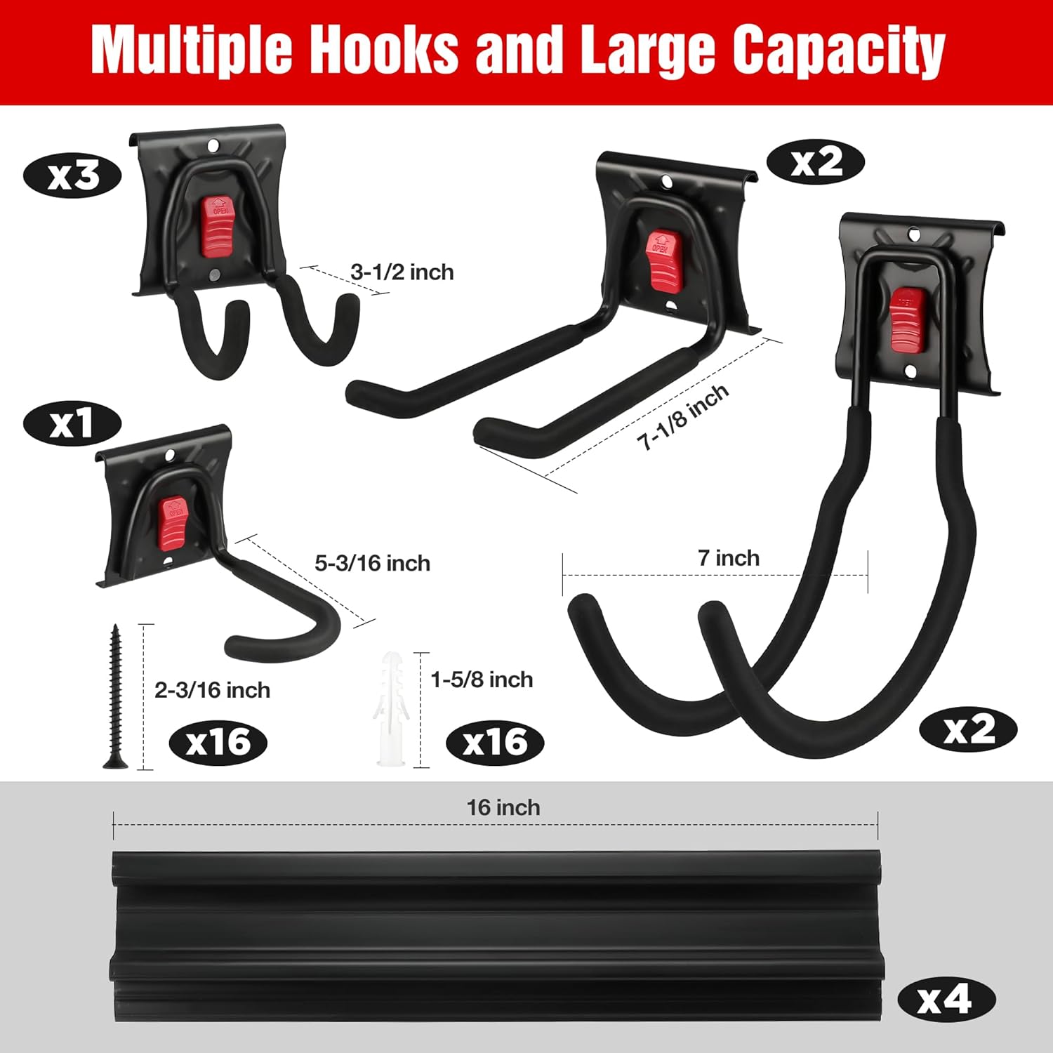 - Package Includes: 4 pcs 16inch tool storage rack, 8 pcs storage hooks in 4 size, assorted anchors and fasteners for fast installation