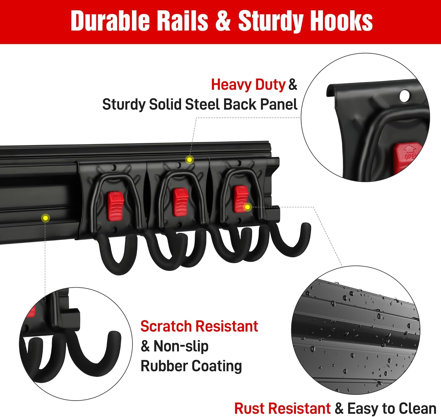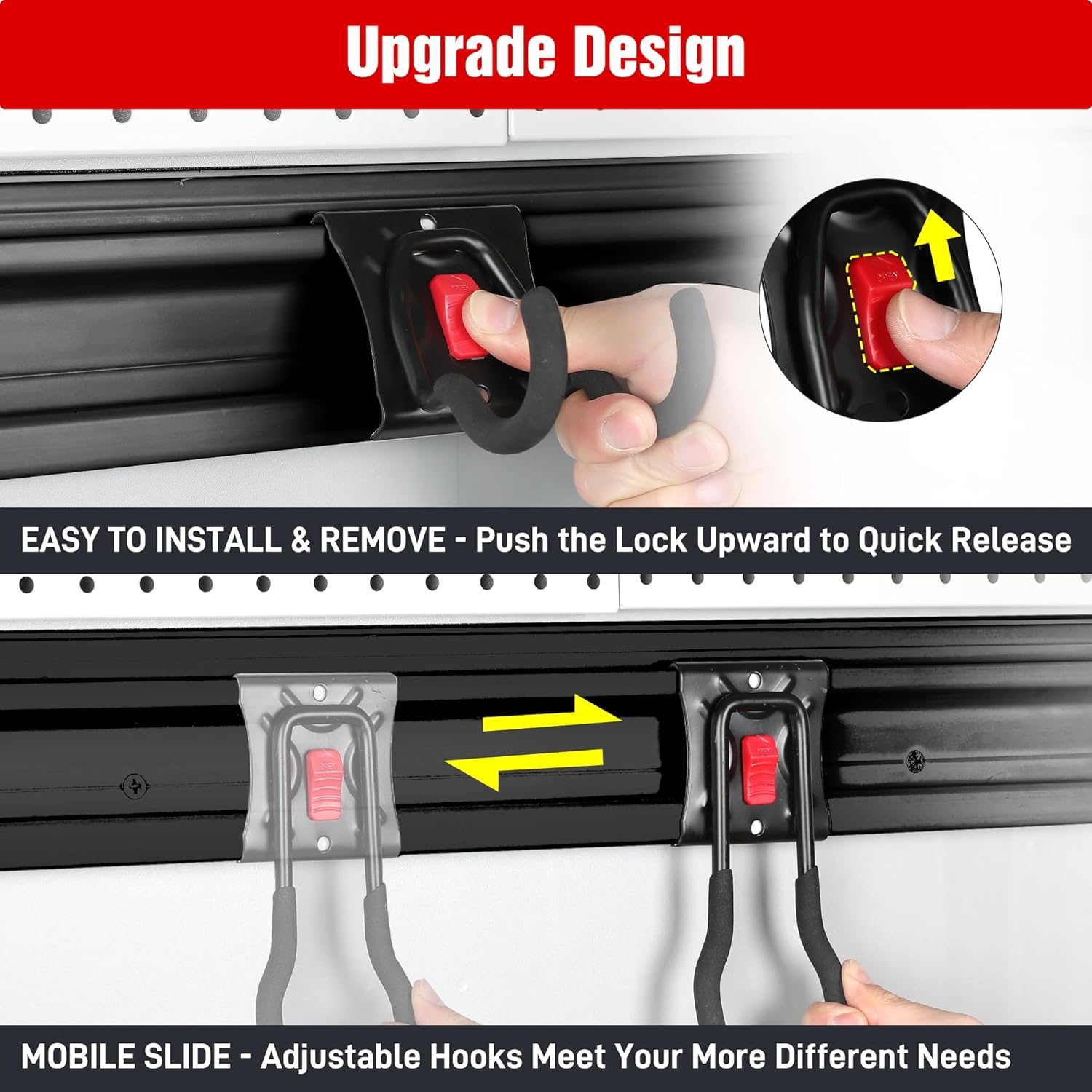 - Adjustable Storage Hooks: The hooks can snap on the rail easily and move around on it to meet your different needs. Upgrade lock design can lock the hook on rail more firmly and easy to release