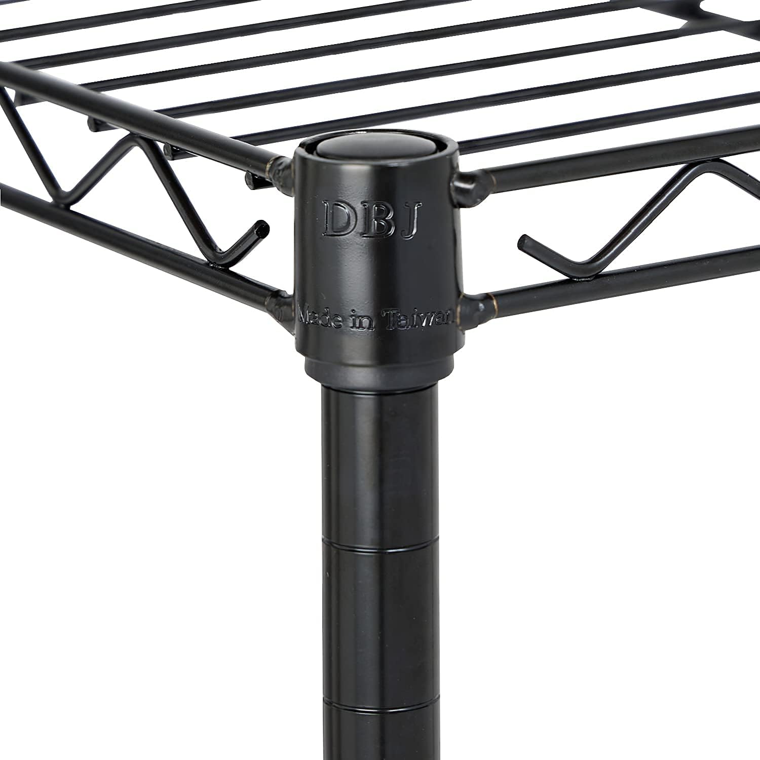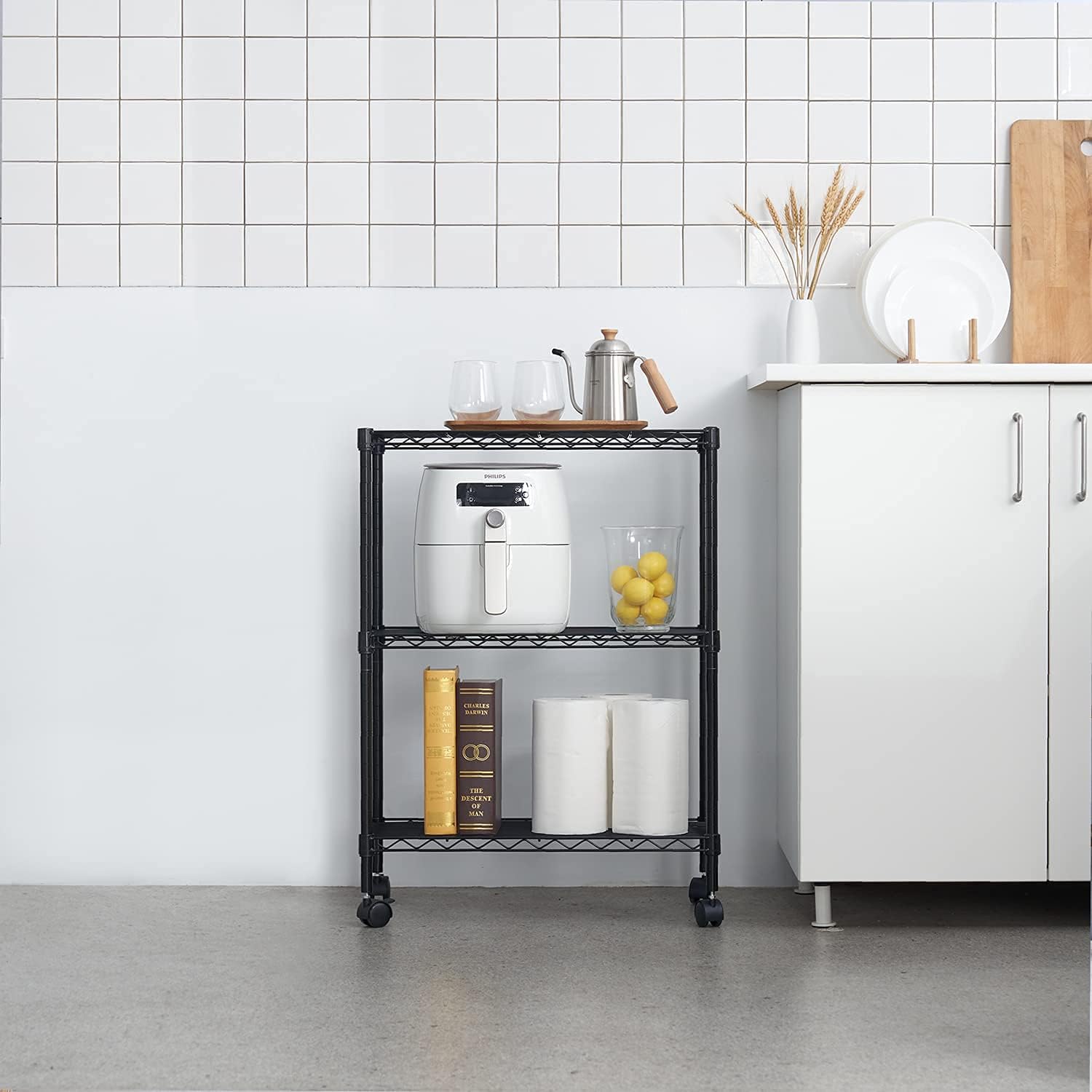 - This black 3 tier wire rack shelving units include nylon wheels (2 Locking), as well as 4 leveling wide feet for mobility.