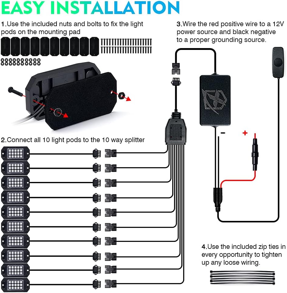- Included Components : Bluetooth RGB LED Rock Lights Kit