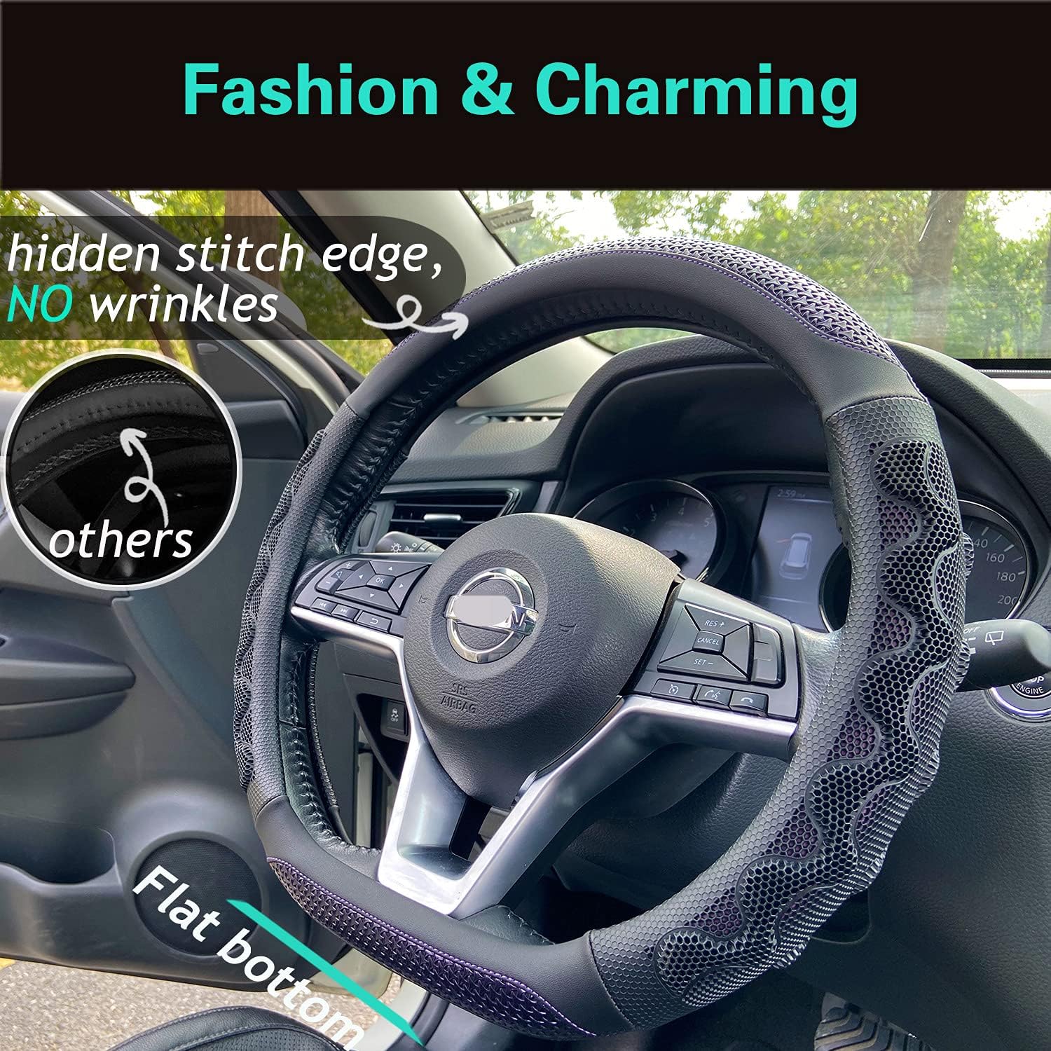 - Perfect Universal Fit: Tailored for Medium-size D Shape steering wheels with a diameter of 14.5-15 inches (37-38 cm) and flat bottoms, our cover is engineered for a snug and secure fit. During installation, a little muscle will effortlessly slip the cover onto the wheel, ensuring a seamless and reliable fit. In the case of some steering wheels with a larger grip circumference, we recommend choosing a size up for optimal installation.