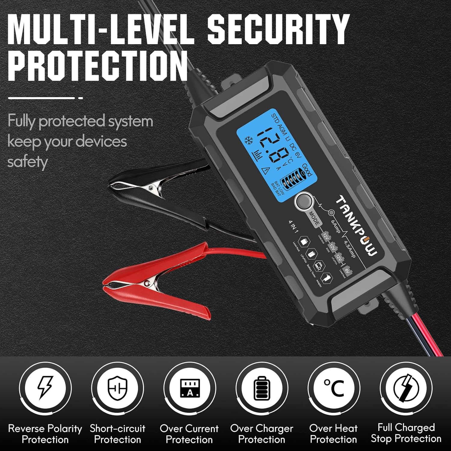 - [4-in-one Battery Charger]: TANKPOW 6-Amp automatic battery charger is perfect for charging all 6V/12V all types of lead-acid batteries and 14.6V Lithium(LiFePO4) batteries, inculding GEL, SLA,GEL submerged (wet) LiFePO4 batteries,lithium batteries,calcium type deep cycle batteries.The automotive charger is ideal for cars,automaive,motorcycles,lawn mowers,tricycles,electric vehicles,agricultural vehicles,off-road vehicles, pickups,snowmobiles,yachts,and motorboats etc,No cooking Fan silent operation