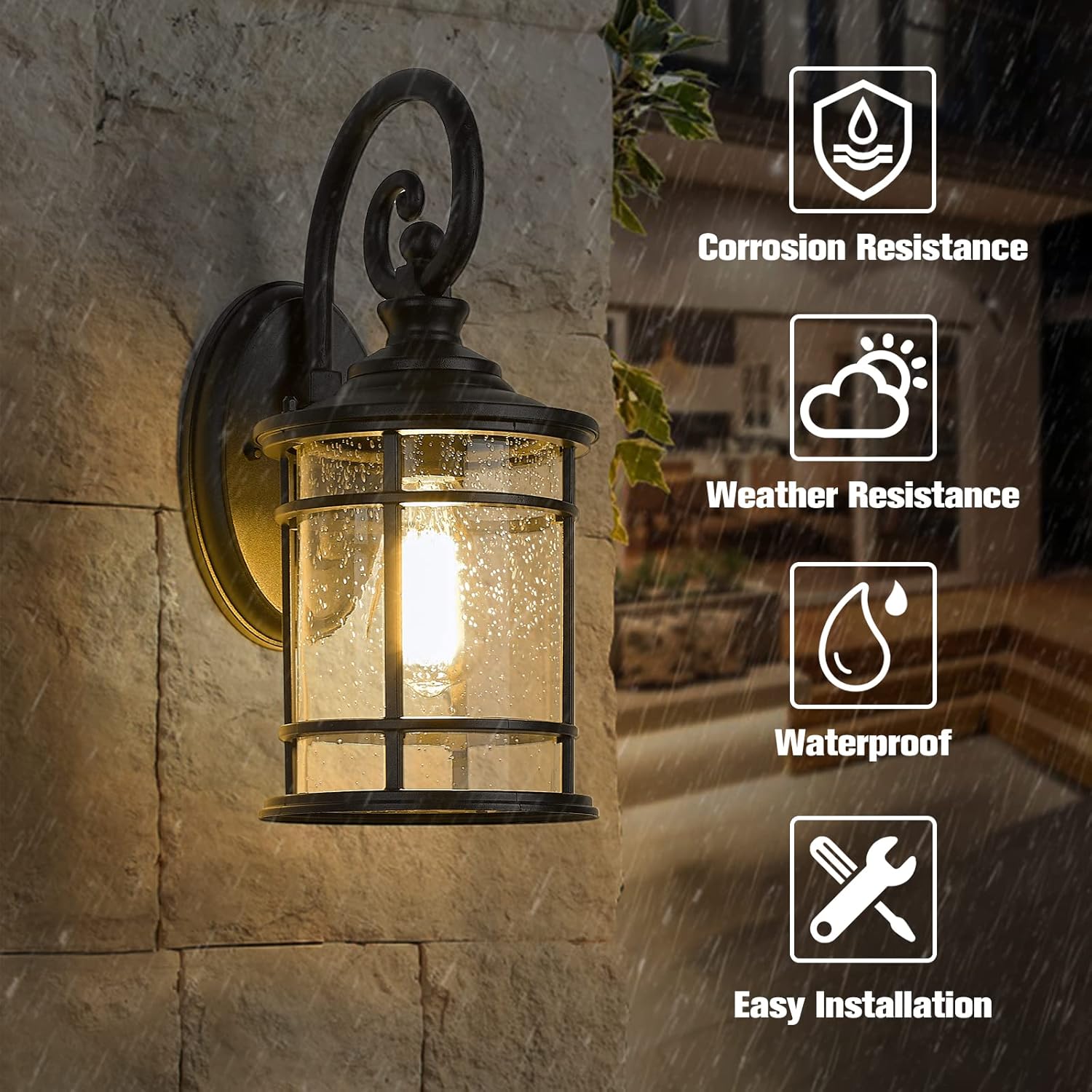 - Weather-resistant and suitable for wet locations, this large outdoor wall light features sturdy aluminum construction and seeded glass shade in a black finish