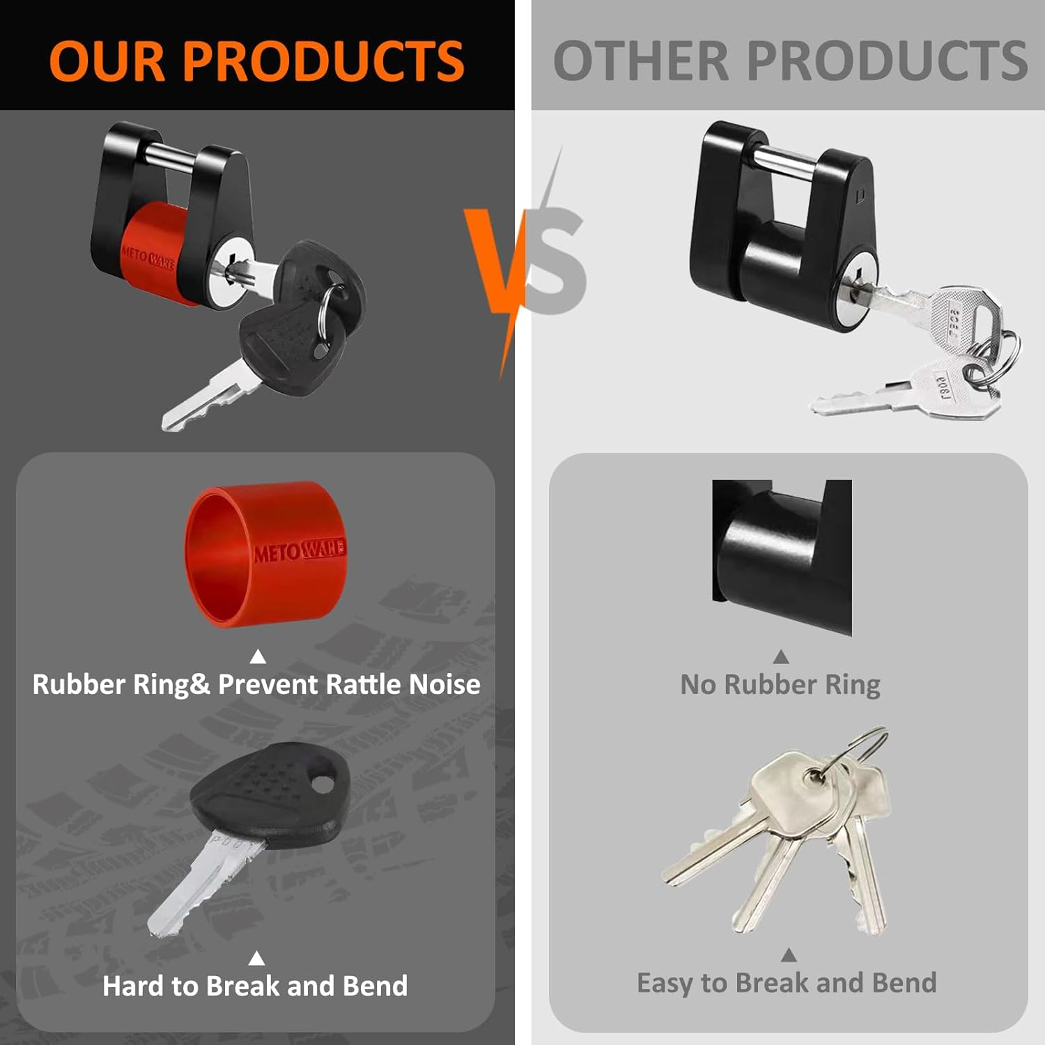 - 【PREMIUM MATERIAL】- Made of premium strength steel and coated with electrophoretic paint, the trailer tongue lock is durable and rust-proof. It is reliable for long-term hauling and secure for full protection, safely protecting your trailer, boat, camper and so on from theft.