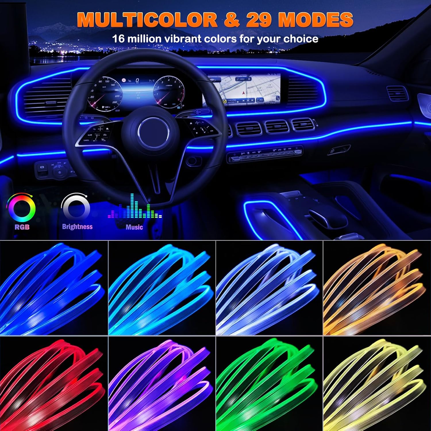 - 16 Million Colors and 29 Modes: Enjoy over 16 million colors and 29 dynamic modes thanks to an intuitive DIY mode. Match different scenes with different color modes to enhance your driving experience and release your emotions. Perfect for your different driving moods or different holiday decorations.