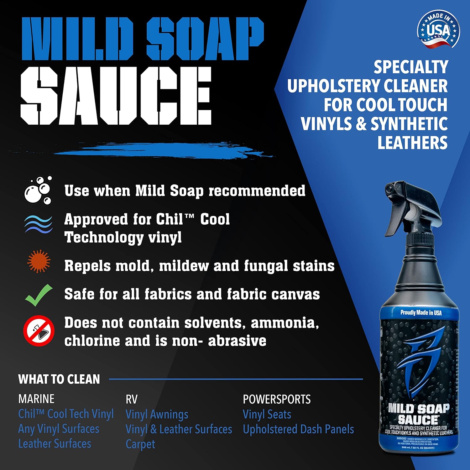 - CLEAN WITH CONFIDENCE โ If you have โChilโ Cool-Touch vinyl, synthetic leather or other specialty upholstery, Mild Soap Sauce is your only effective cleaning option. The proprietary formula was developed in partnership with leading OEM vinyl and upholstery manufacturers to ensure compliance with factory warranty.