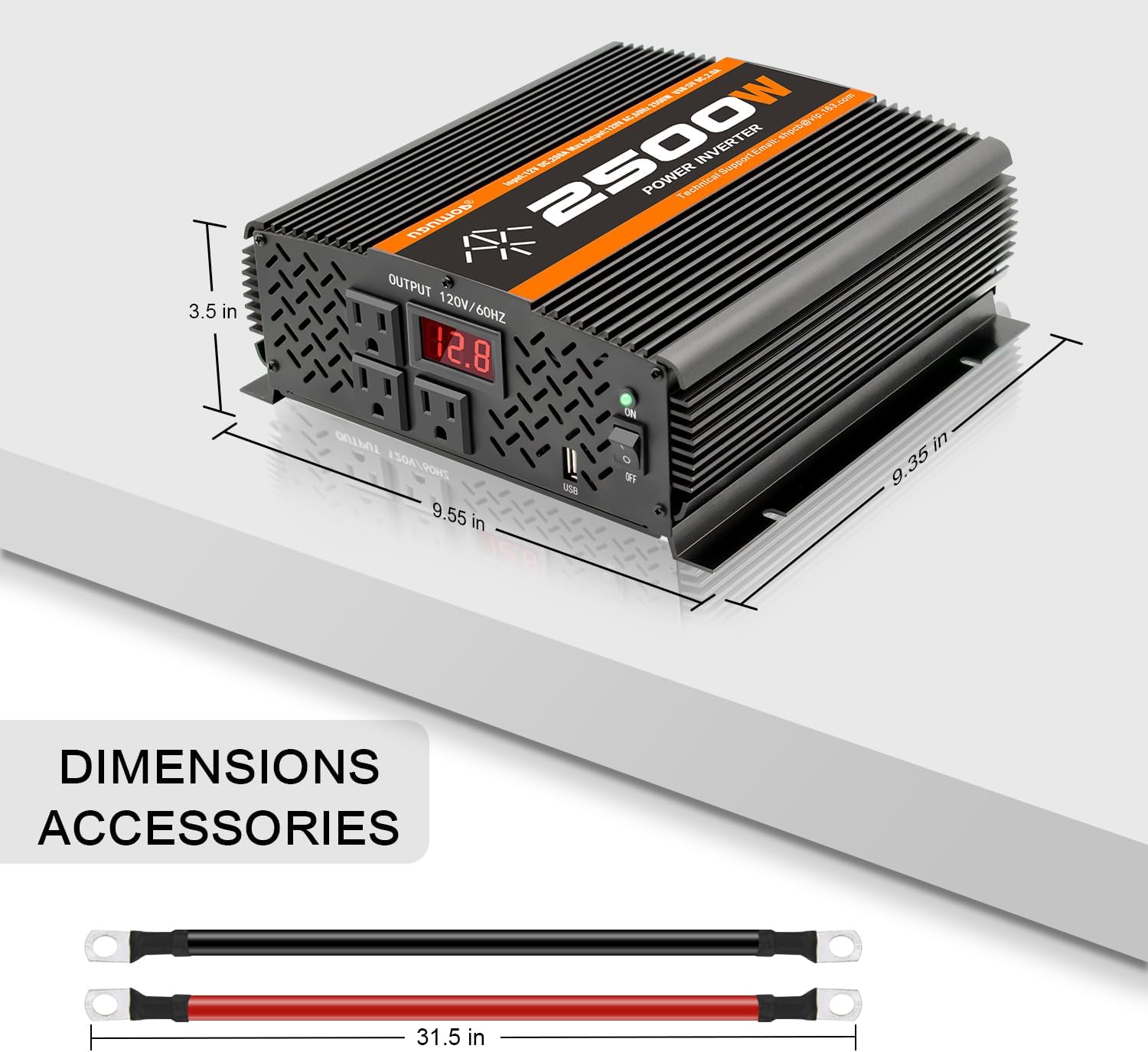 - 2.【Safe charging technology& Stability】: This 2500W inverter has 10x30A built-in fuses to protect the inverter and your device from short circuit current ; Its stable charging technology protect the 12V car inverter against overheating, under and over voltage charging, short circuiting, overloads, and overcharging.
