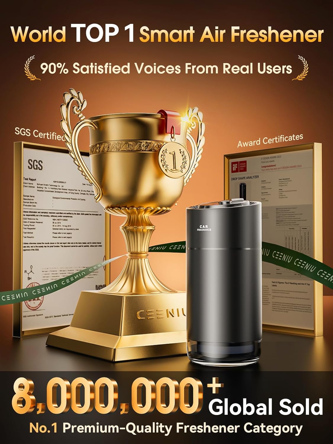 Ceeniu Smart Car Air Fresheners, New Smell Experience By Ultrasonic mist, Auto On/Off, Powerful Built-in Battery, Natural Fragrance, Adjustable Car freshener, Cologne Scent