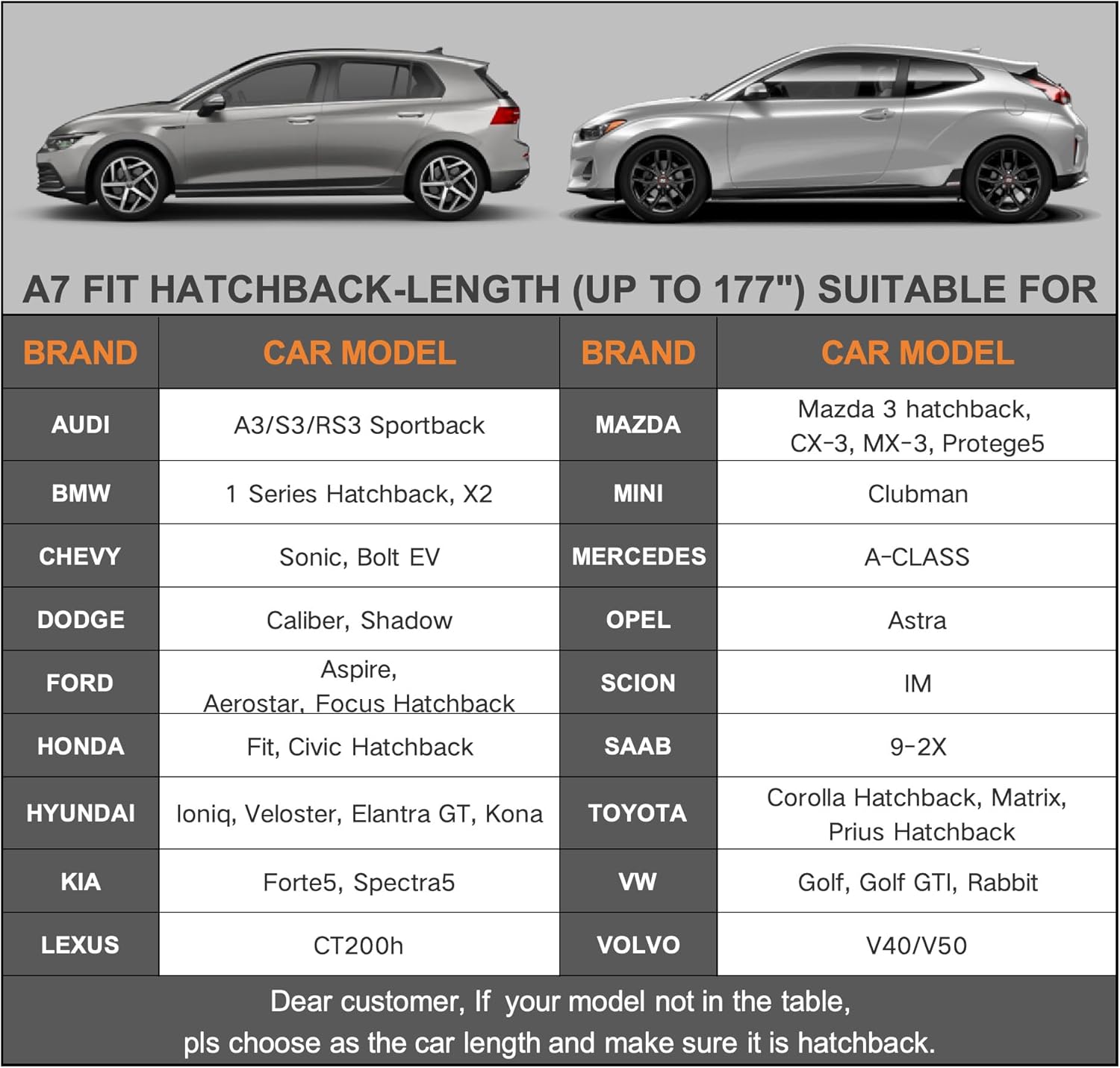 - ăDimension A7ăâ Universal fit for hatchback which length is up to 177 inch (NOT FOR SEDAN AND SUV). Suitable for VW Golf/Gti/Rabbit, Mini Clubman,Toyota Matrix, Honda Fit, Bmw 1 Series/X2, Lexus CT200, Hyundai Veloster, Ford Focus hatchback, Chevy Bolt, Chrysler pt cruiser, Audi A3 hatchback etc.