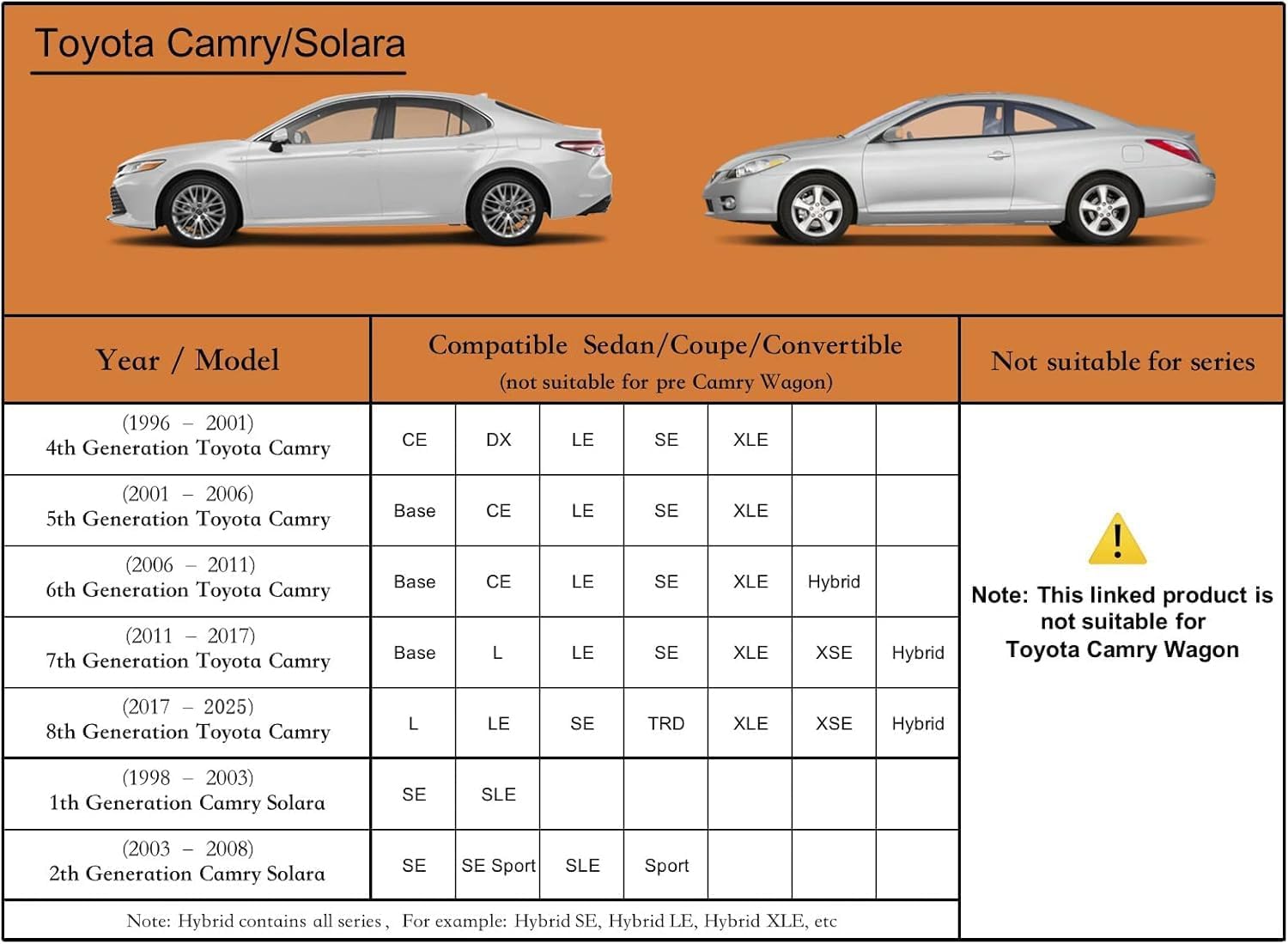 - ăSuitable forăâ Custom fit for Toyota camry Sedan/Coupe/Convertible CE/ DE/ LE/ SE /XLE /Base/Hybrid Etc(1996-2025), Not suitable for camry wagon. Cover length:193''L x 72''W x 59''H, you need to measure your for car length from the front bumper to back bumper, If you are still unsure, please refer to Figure 5 or consult customer service.