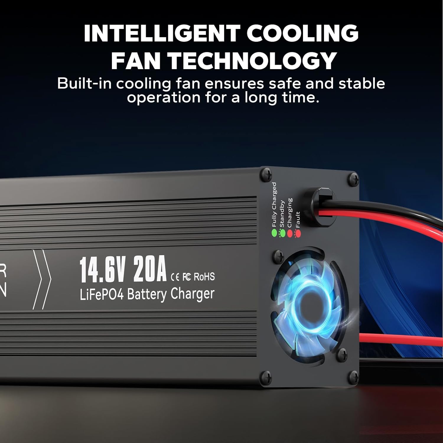 - 【PREMIUM QUALITY】Our LiFePO4 lithium batteries charger is made of aluminum alloy with surface oxidation treatment, high hardness, anti-oxidation, the built-in cooling fan keeps the charger itself cool. Heat dissipations protect your charger and battery. It’s safe in charging.