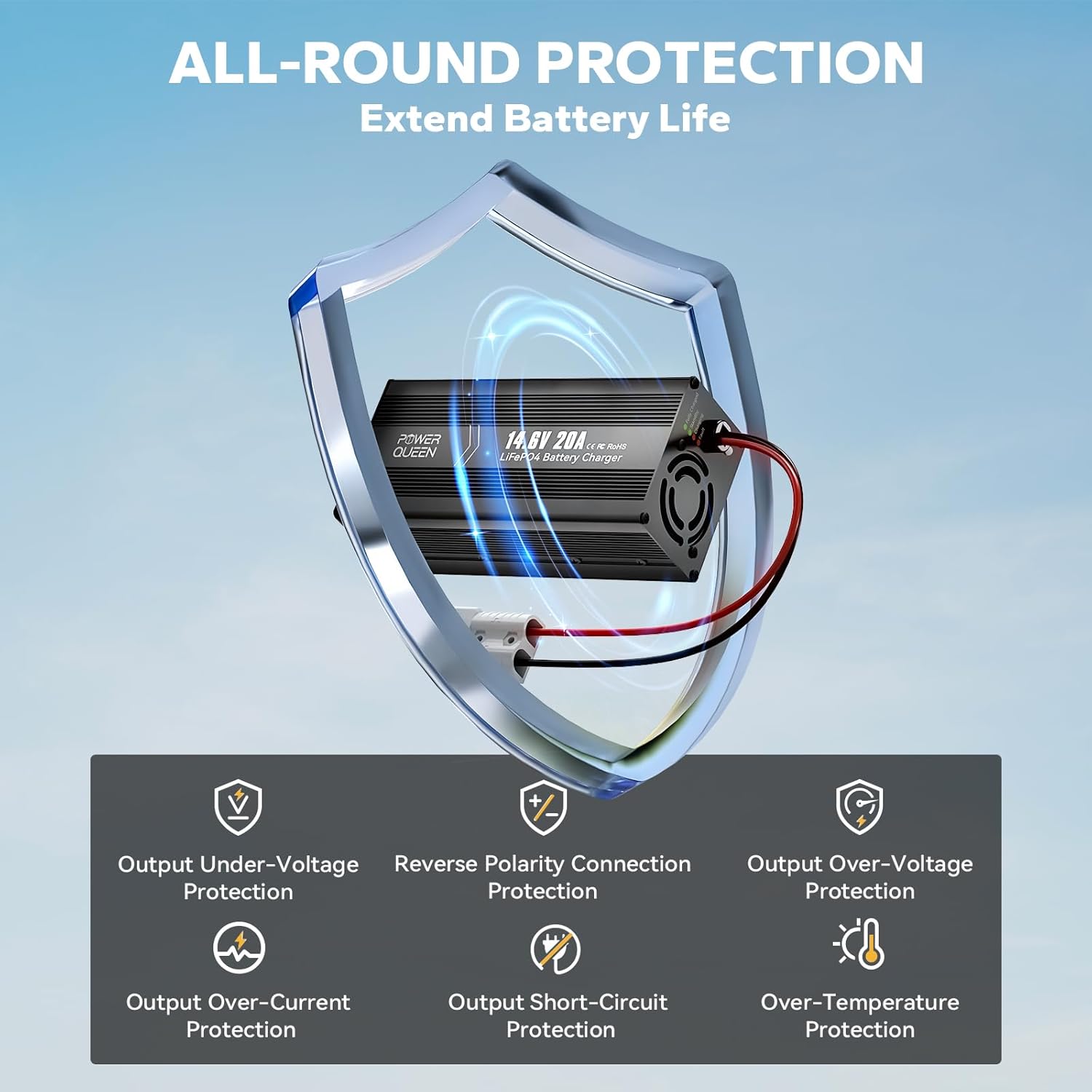 - 【MULTIPLE PROTECTION】Power Queen 14.6V 20A LiFePO4 lithium batteries charger has multiple protection, such as over-temperature protection, output short-circuit protection, reverse polarity connection protection, and output over-voltage protection to prevent damage from faulty operation.