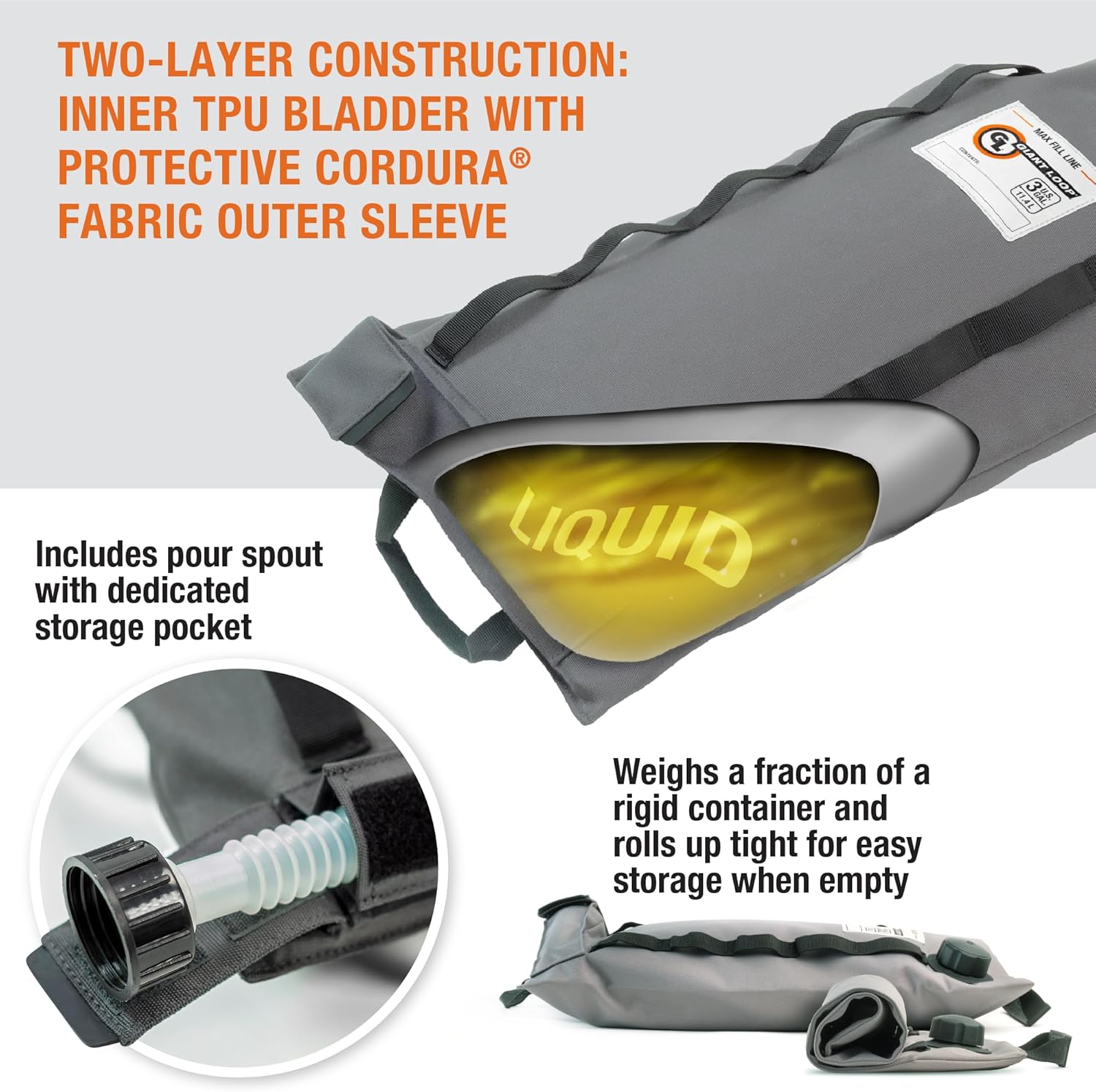 - DURABLE MATERIAL: Employs a two-layer construction, including an RF-welded inner bladder thatβs protected by a highly abrasion resistant sewn Cordura outer sleeve. The bag also features webbing and rubber-molded handles that make filling and installing the pour spout and dispensing liquids easier