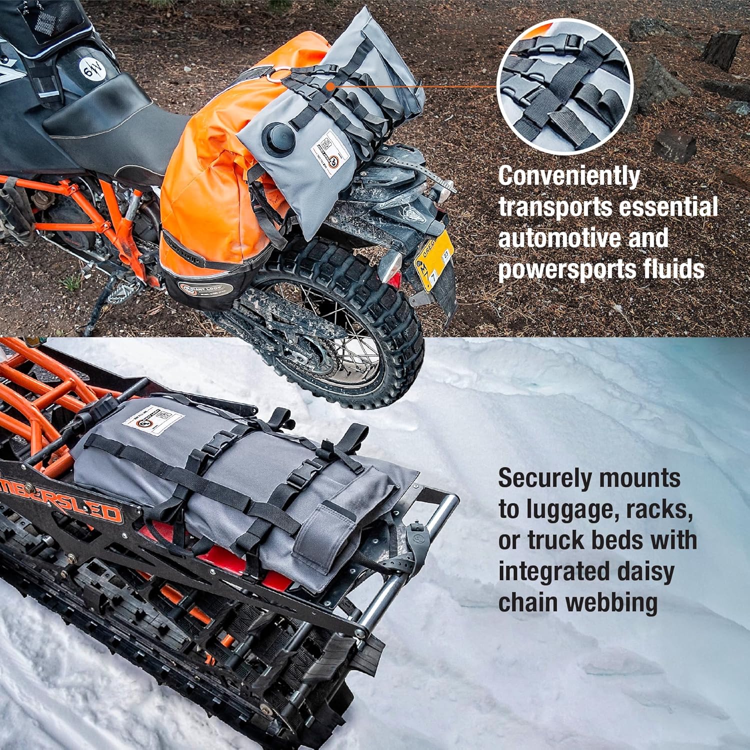 - SAFE TRANSPORT OF AUTOMOTIVE FLUIDS: Giant Loop's Armadillo Bag is a flexible, collapsible, lightweight and portable utility bladder for the safe transport and storage of liquid hydrocarbon products and other powersports and automotive fluids. It rolls up or packs flat when empty, making it convenient to carry around