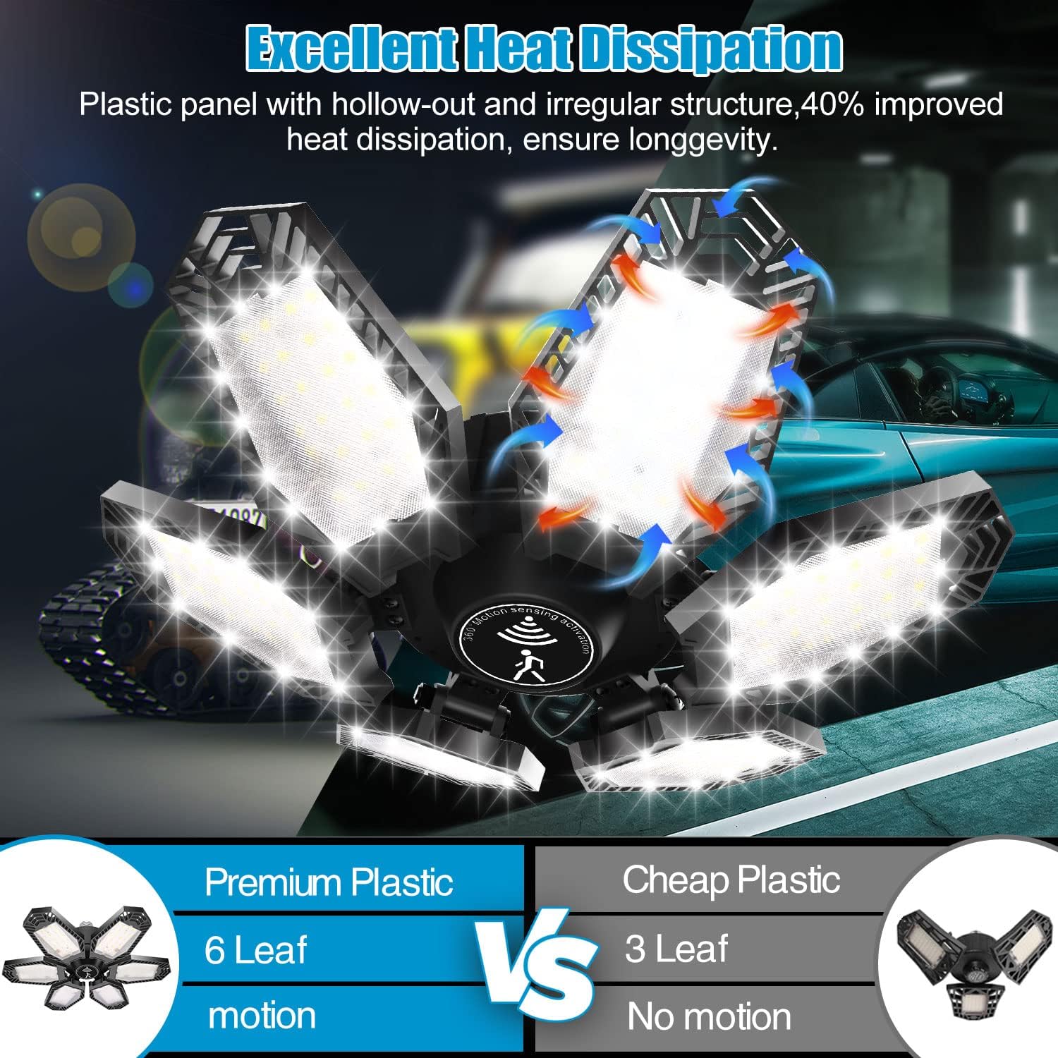 - ✔【Long Life LED Garage Light】Premium plastic heat dissipated, high-temperature resistant, stable and durable under maximum performance,ensure the lifespan is up to 50,000 hours.Normally, motion sensor garage led light is more energy saving than fluorescent lamp and incandescent, garage lighting can be 8 times energy saving of traditional bulbs.