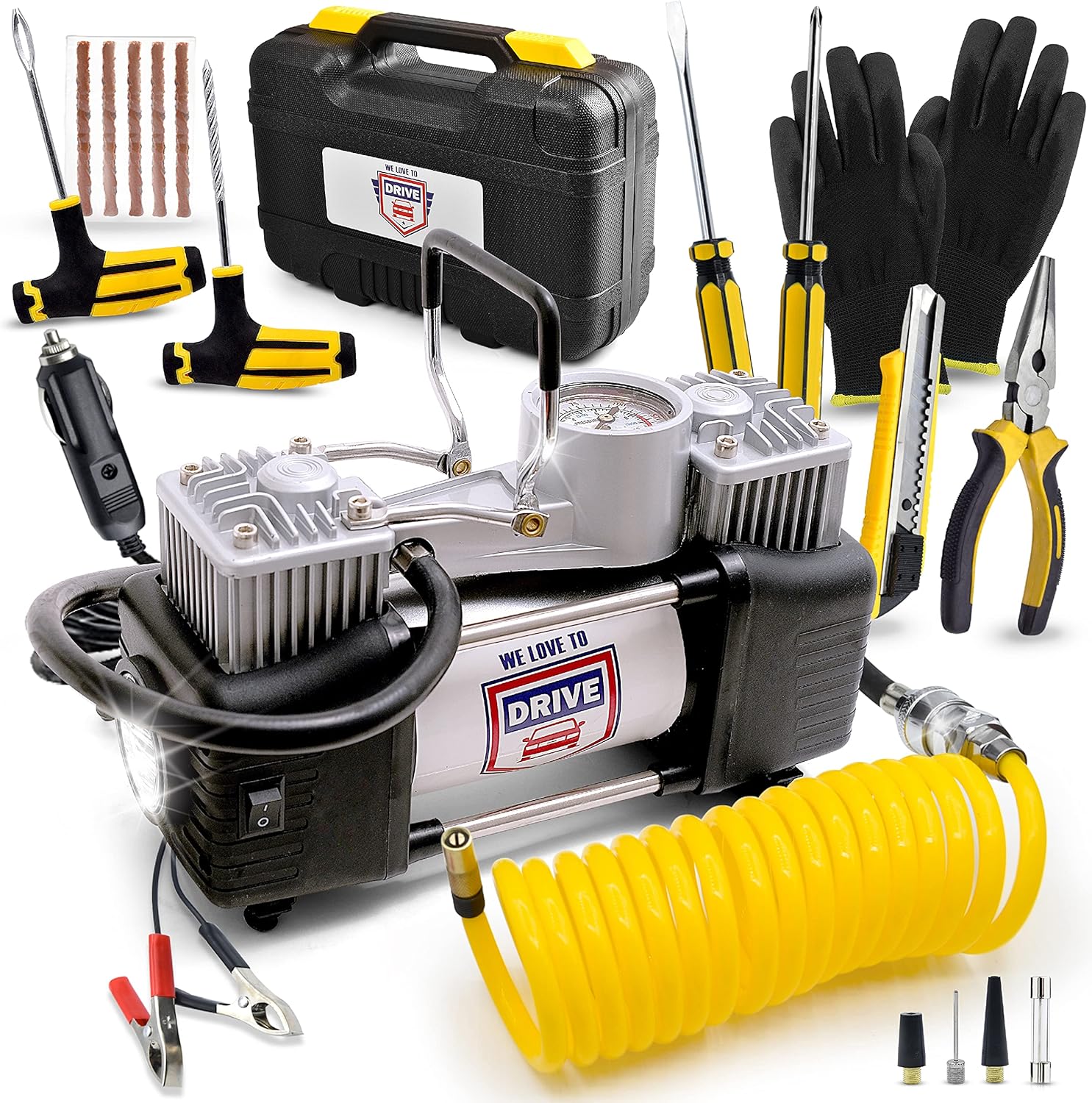 - Powerful & Reliable Tire Inflator Easily manage tire inflation with this Dual Cylinder Portable Tire Inflator for Car. Designed for cars, trucks, and SUVs, this Portable Air Compressor for Car Tires provides up to 150 PSI for heavy-duty tasks. The built-in Tire Pressure Gauge ensures accuracy and efficiency. Lightweight and compact, this Car Tire Air Pump Portable fits in an Emergency Roadside Kit for Car, making it an essential addition to your Road Trip Essentials.