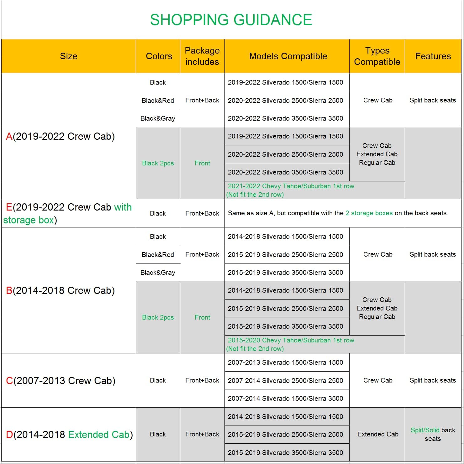 - Please choose the correct size of custom fit seat covers from size A B C D E