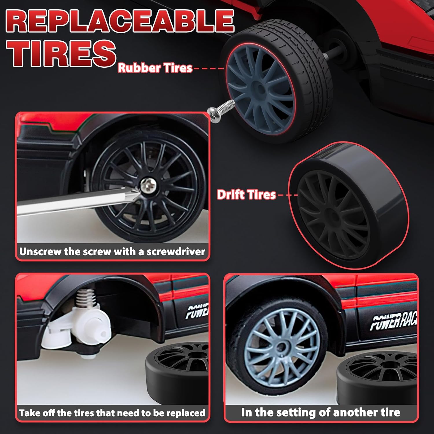 - Rechargeable Fast Car: Full function RC drift car with a rechargeable battery. Don't worry about being out of charge anymore. Forward, reverse, left/right turn, front LED lights, U-shaped drift, figure 8 drift, all-wheel drive
