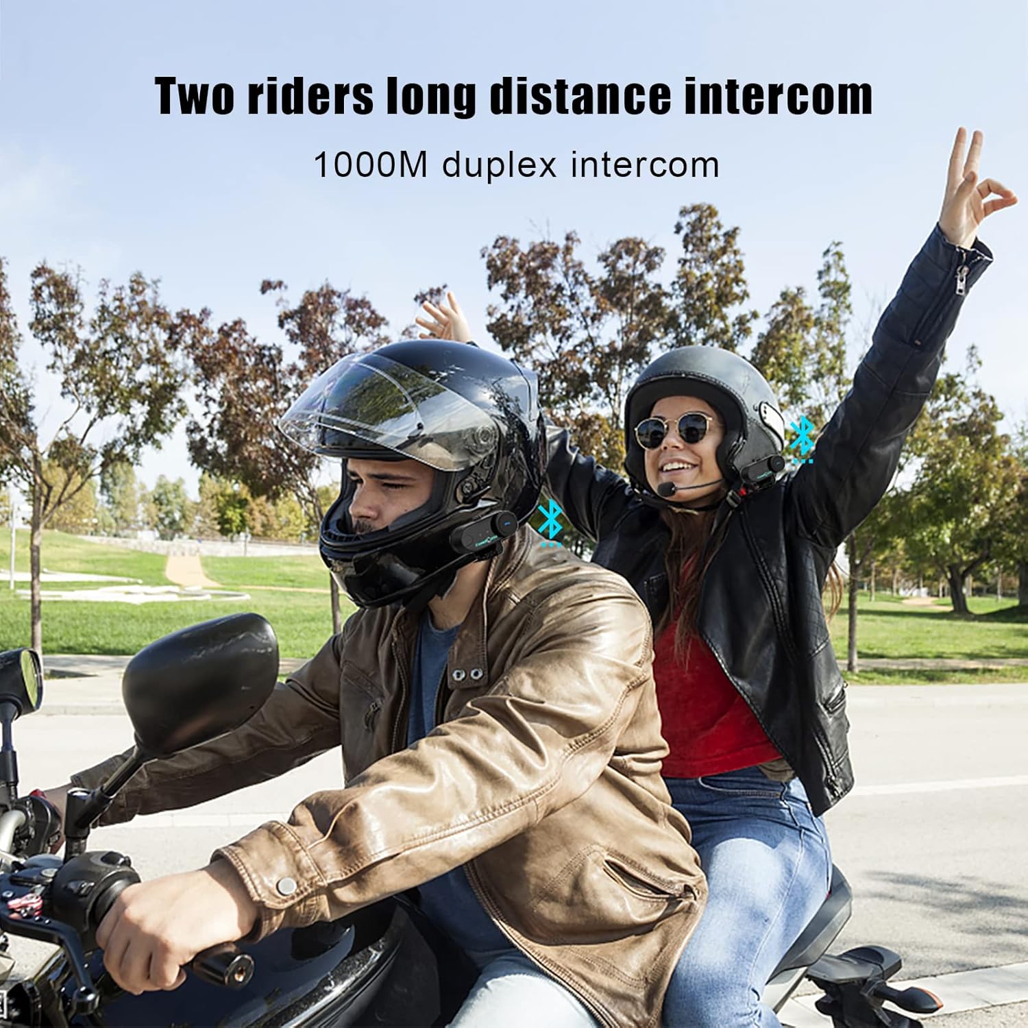 - 【3-Rider Conference Mode】This motorcycle helmet bluetooth headset delivers 800m-range intercom. Share Spotify playlists between 2 headsets while coordinating with 3 additional riders via group channel