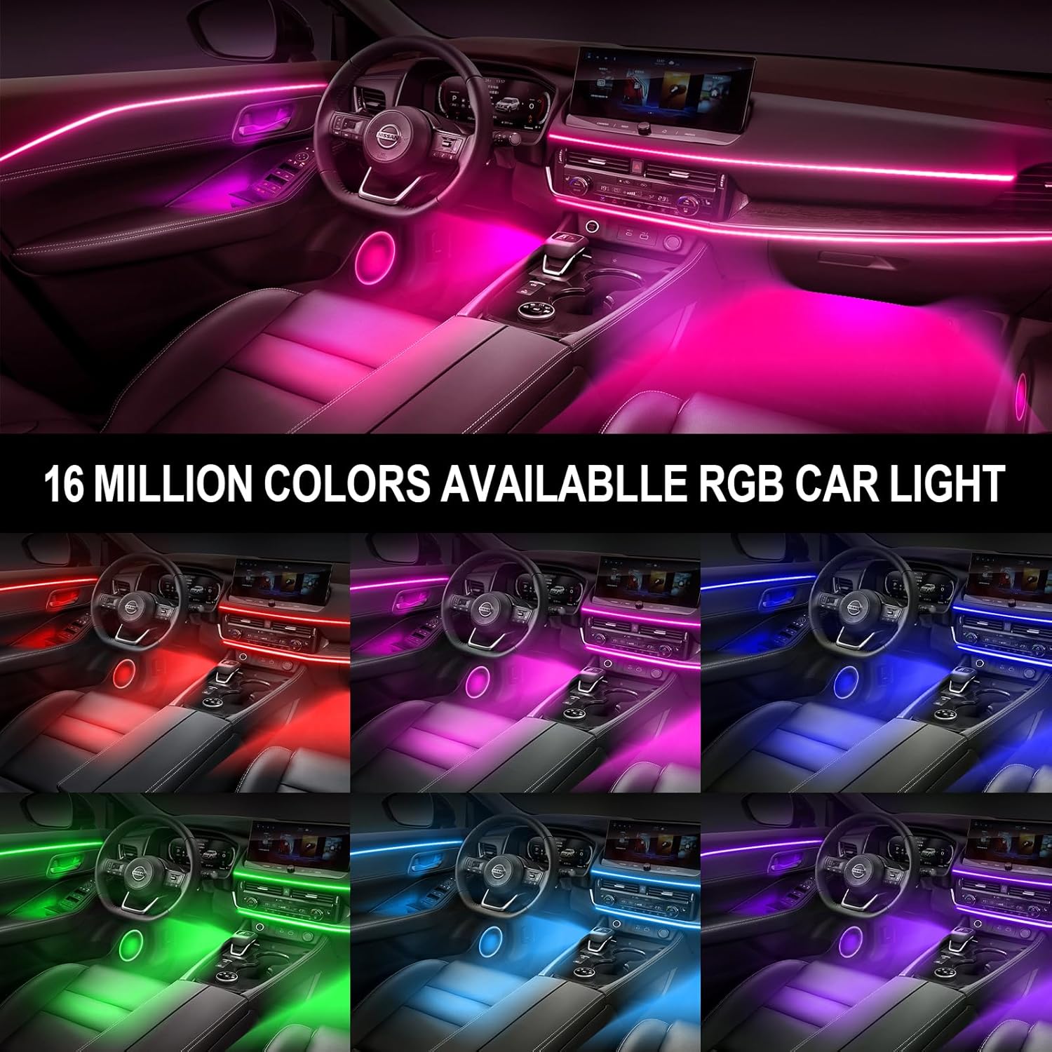 - ăUpgraded Acrylic 10-in-1 Car Ambient Lightă This interior car LED light consists of 6 acrylic fiber optic light strips(175-inch 593 LED lights) and 4 under dash lights, and has one master controller and 4 slave controller, which can be flexibly installed in any car without clutter.