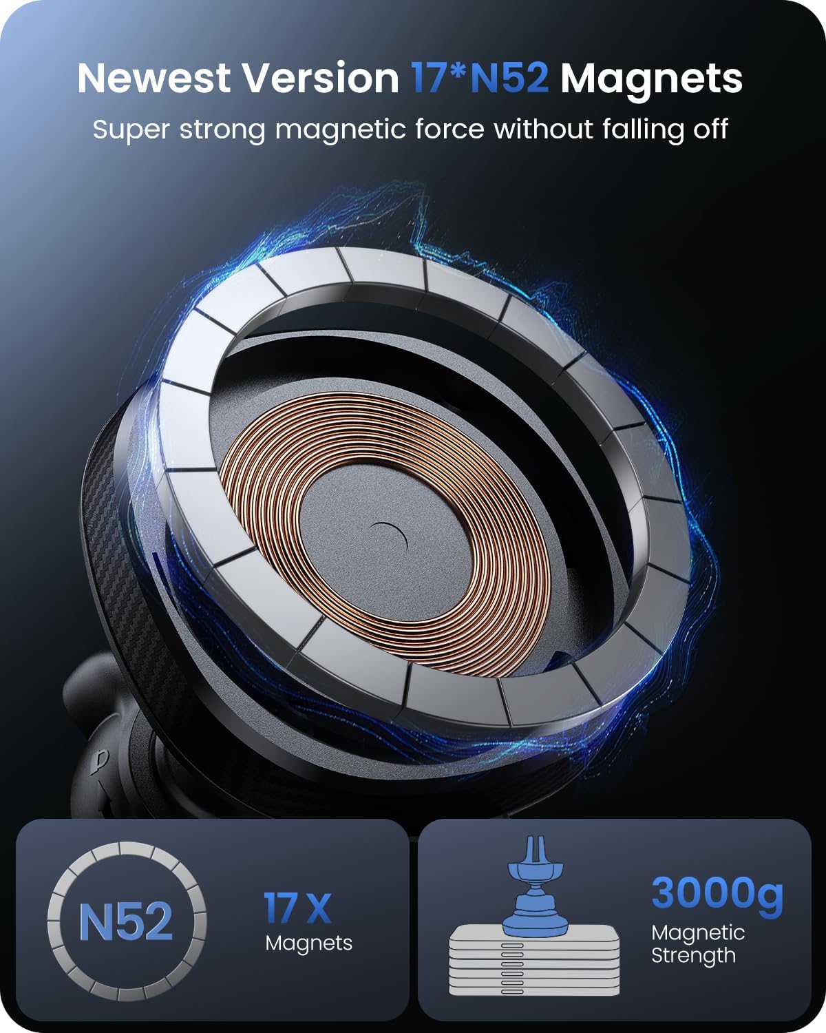 - ăUpdated 17 x N52 Strong MagnetsăBuilt-in powerful 17 x N52 magnets ring will firmly suction up your phone, ensuring your iPhone 16/15/14/13/12 stays secure throughout your drive