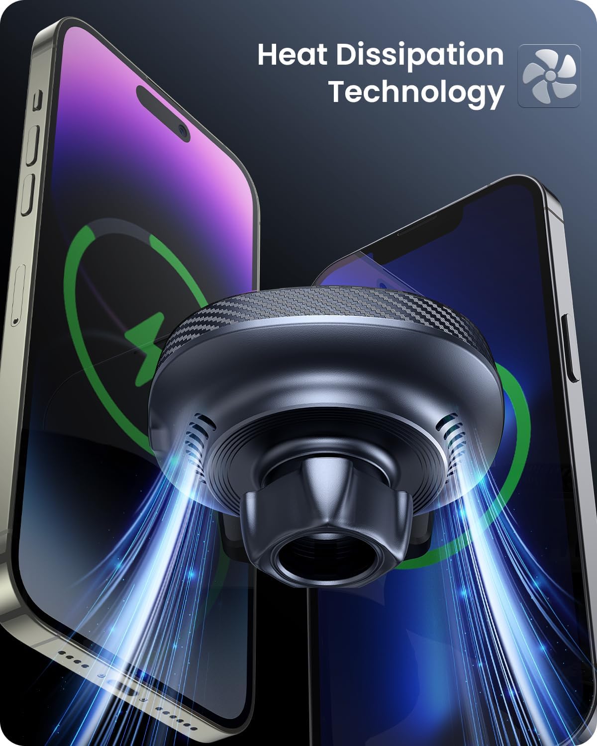 - ăCooling Fans & 15W Fast ChargingăThis wireless car charger has built-in phone cooling fans and a heat dissipation system, which provides excellent temperature control during charging. No worry about it getting overheated anymore even if you use this mag safe car charger for a long time, giving your phone better protection. Includes orange/black cable (random color).