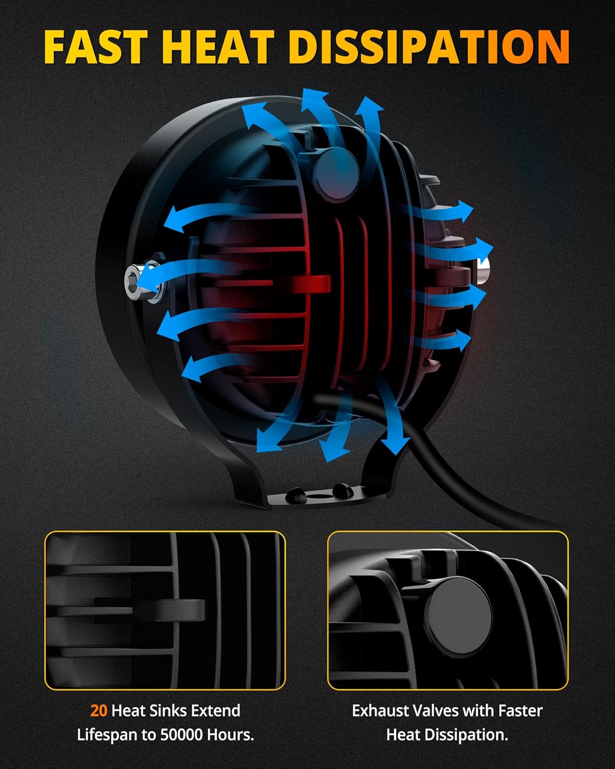 - [DESIGNED FOR DURABILITY] - The 4inch round led auxiliary lights benefit from quick cooling aluminum alloy heat sinks and high-quality heat conduction silicone gel,which carefully designed 13 radiator fins and breathable valveto dissipate the temperature into the surrounding air effectively extend the lifespan of the light bar to over 50,000 hours.