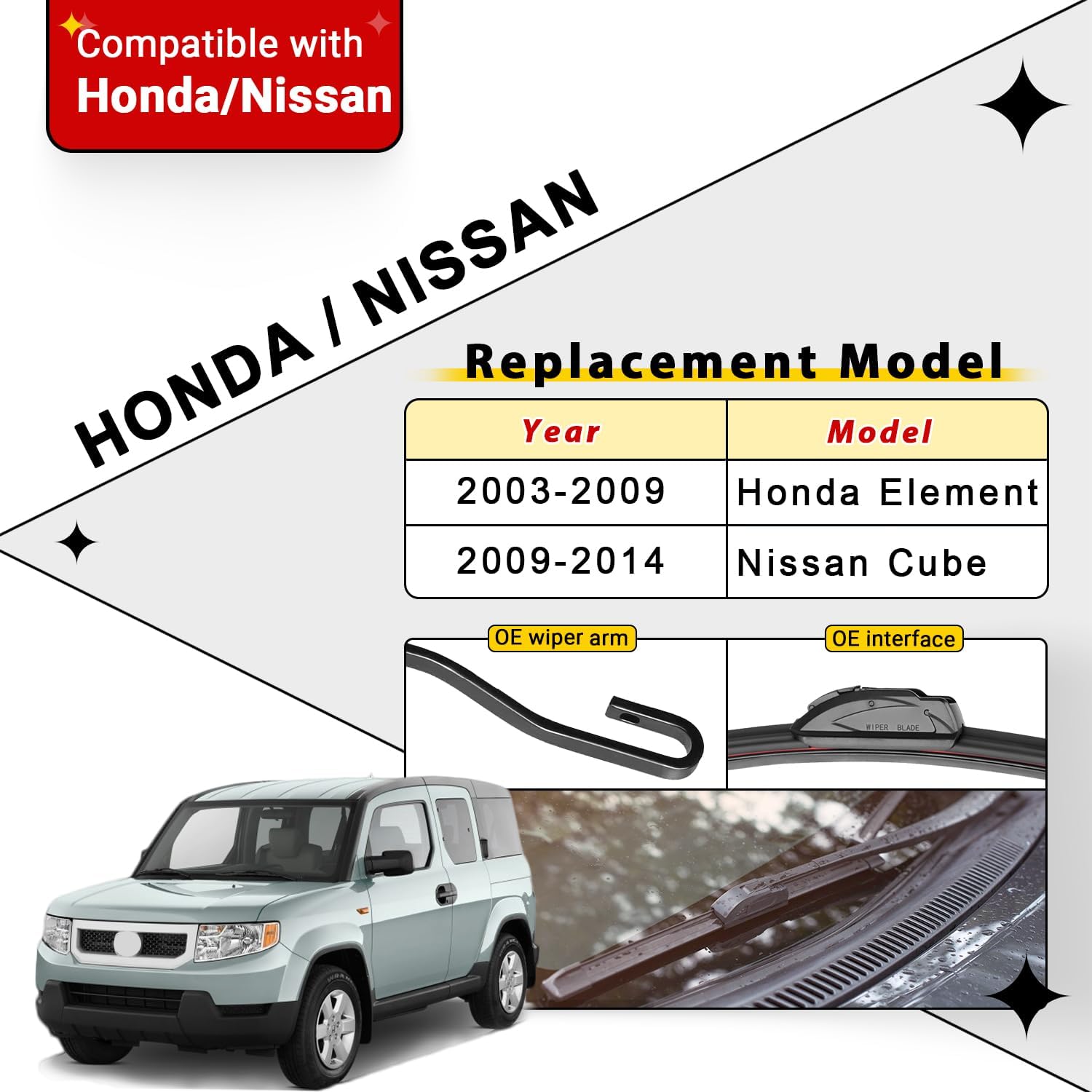- {FITMENT1}: Replacement for 2003 2004 2005 2006 2007 2008 2009 Honda Element 20inch + 20inch front with 12inch rear windshield wiper blades.