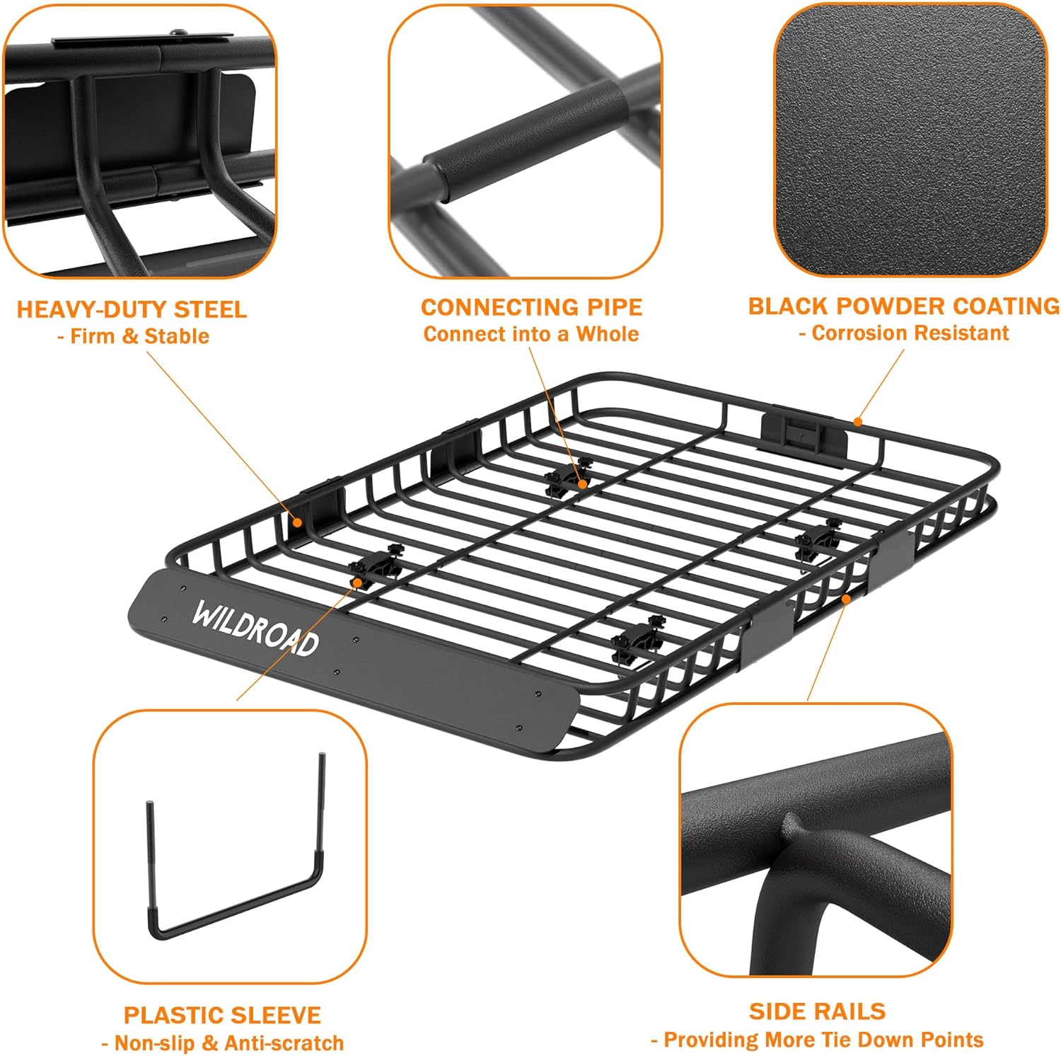 - HEAVY DUTY: Wildroad roof basket made of solid and premium steel pipe can hold up to 150 lbs cargo. Durable black powder coating prevent it from all weather conditions. Highest standard craftsmanship in the industry ensure its quality, each screw matches welding frame accurately.