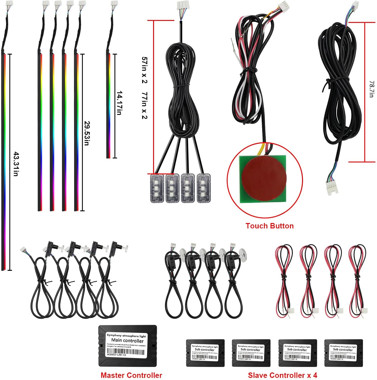 - ăRGBI Dreamcolor 18-in-1 Car Ambient Lightă This interior car LED light consists of 6 acrylic fiber optic light strips(175-inch 593 LED lights) , 4 under dash lights, 4 door handle light and 4 door storage box light, and has one master controller and 4 sub controller, which can be flexibly installed in any car without clutter. The dreamcolor lighting effect of the upgraded RGBIC can bring you a different experience.