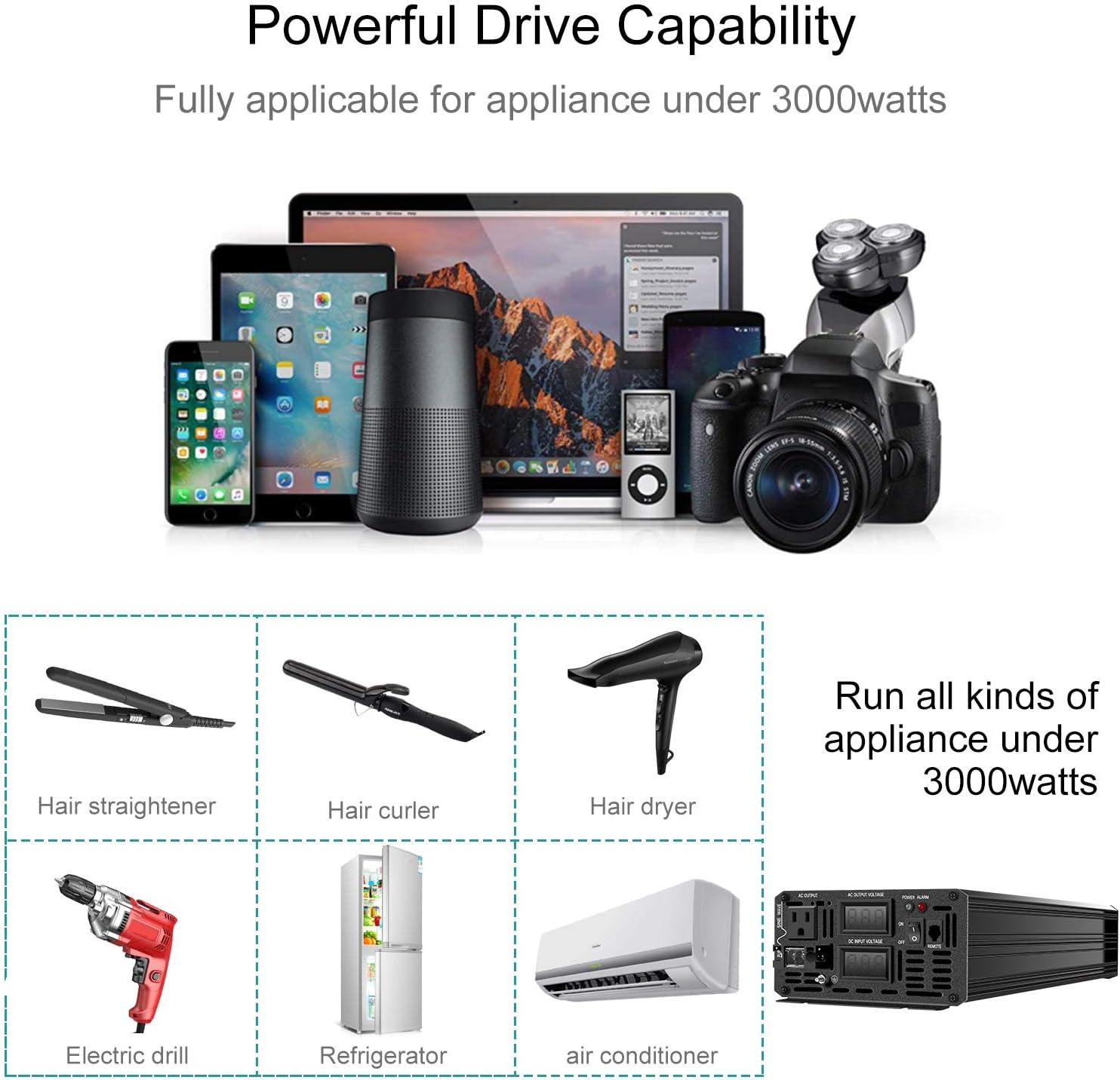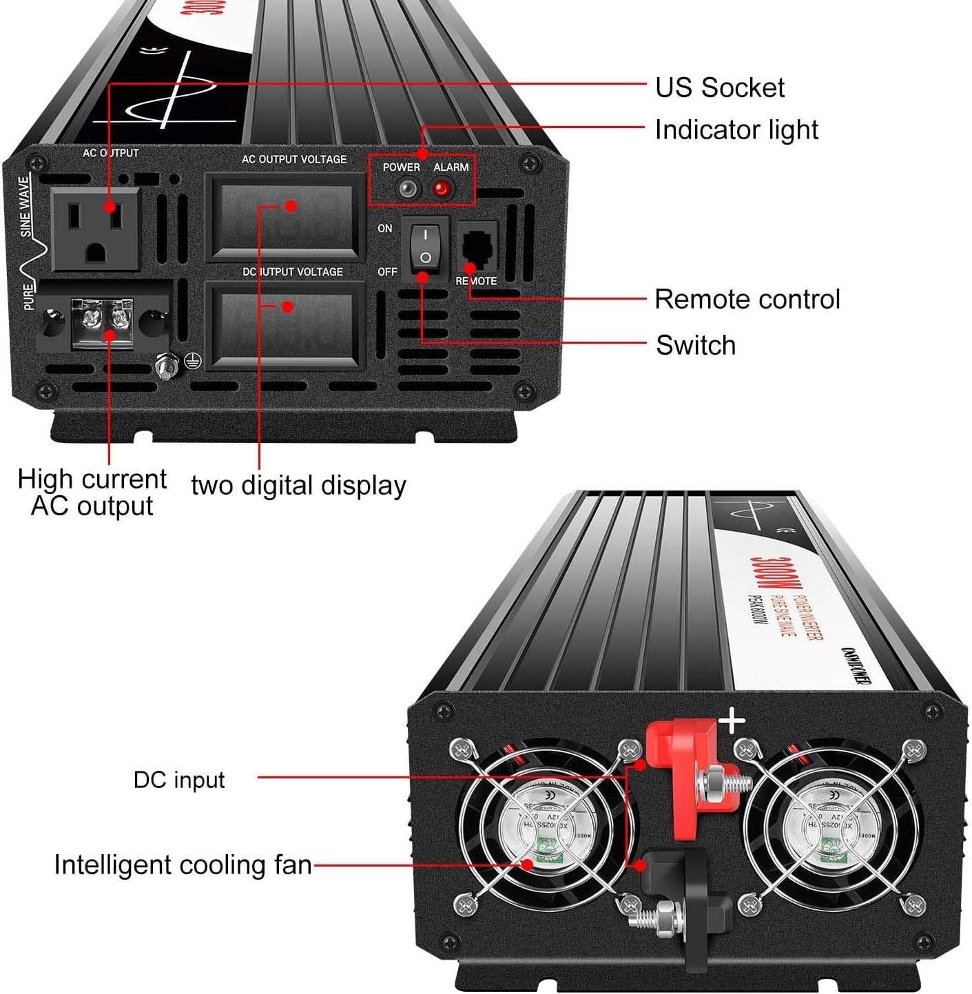 - [True Pure Sine Wave Power Inverter] True rated continuous 3000Watts pure sine wave output power and 6000 Watts peak power.LED display.Perfects for off-grid system,Lower THD,Less wear,Strong inductive Loads Capability.It has little interference with radios, communication and precision equipment.It's also recommended by most cordless tool manufacturer that a pure sine wave inverter is used to ensure long battery life.