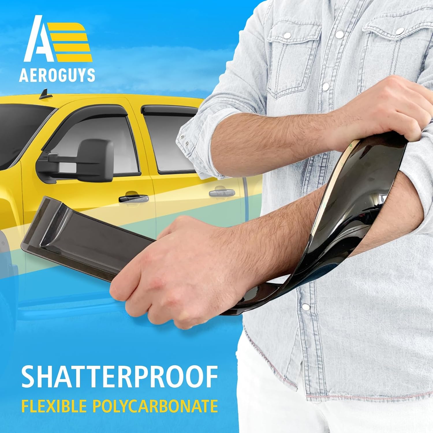- No Tools Needed, Quick and Easy Assembly β These rain guards are very easy to fit. TAPE-ON INSTALLATION provides perfect fit for your truck. Just slip it onto your carβs window and your job is done within minutes. There is no drilling or no tools required. Be sure that AEROGUYS window deflectors are water resistant, sun protective and will not bend, break or crack regardless of the weather conditions.