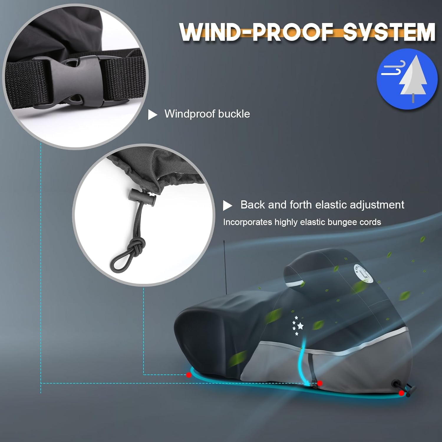 - Details Improvement : Adjustable elastic band is added to the whole circle of the bottom of the motorcycle cover, with an adjustable windproof buckle in the center, which can be adjusted to make the cover and the motorcycle tighter. In addition, the front section of the cover has an ABS lock hole.