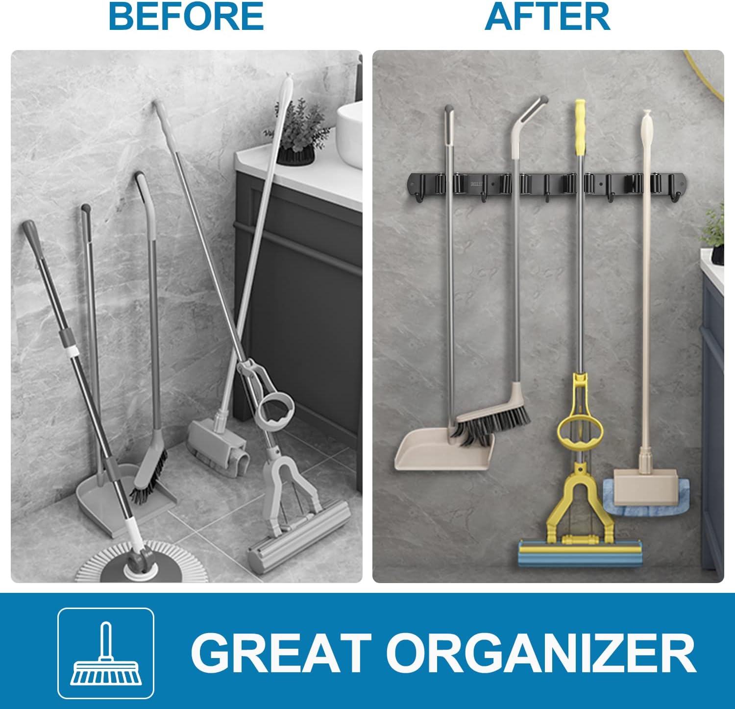 - VERSATILE DESIGN: You can easily organzier your home, such as laundry room, kitchen, closet, garage, pantry, basement. This garage organizer also works garden or a shed. You can easy access your broom, mop, swifter, dust pan, small vacuum, rakes, shovels and more