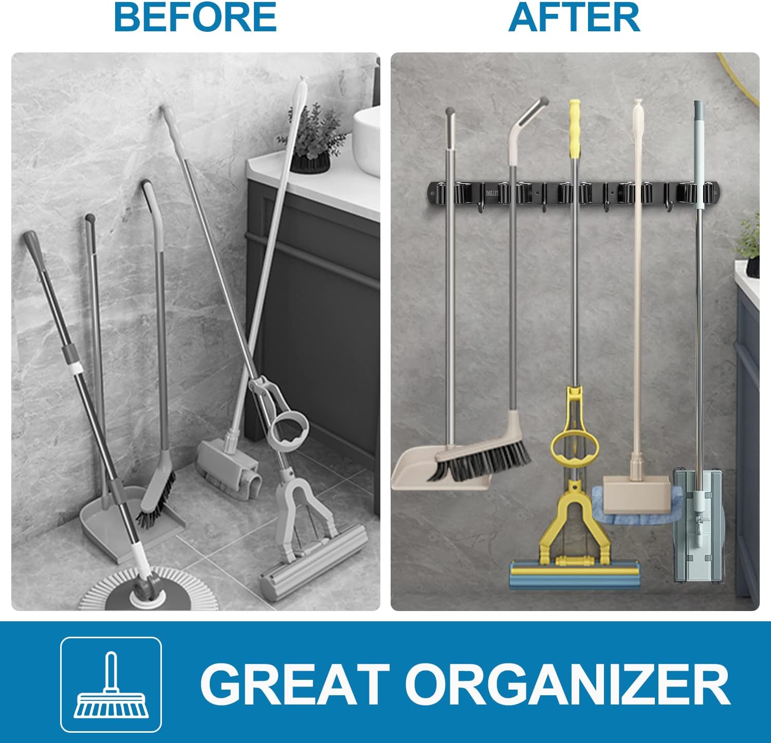 - VERSATILE DESIGN: You can easily organzier your home, such as laundry room, kitchen, closet, garage, pantry, basement. This garage organization also works garden or a shed. You can easy access your broom, mop, swifter, dust pan, small vacuum, rakes, shovels and more