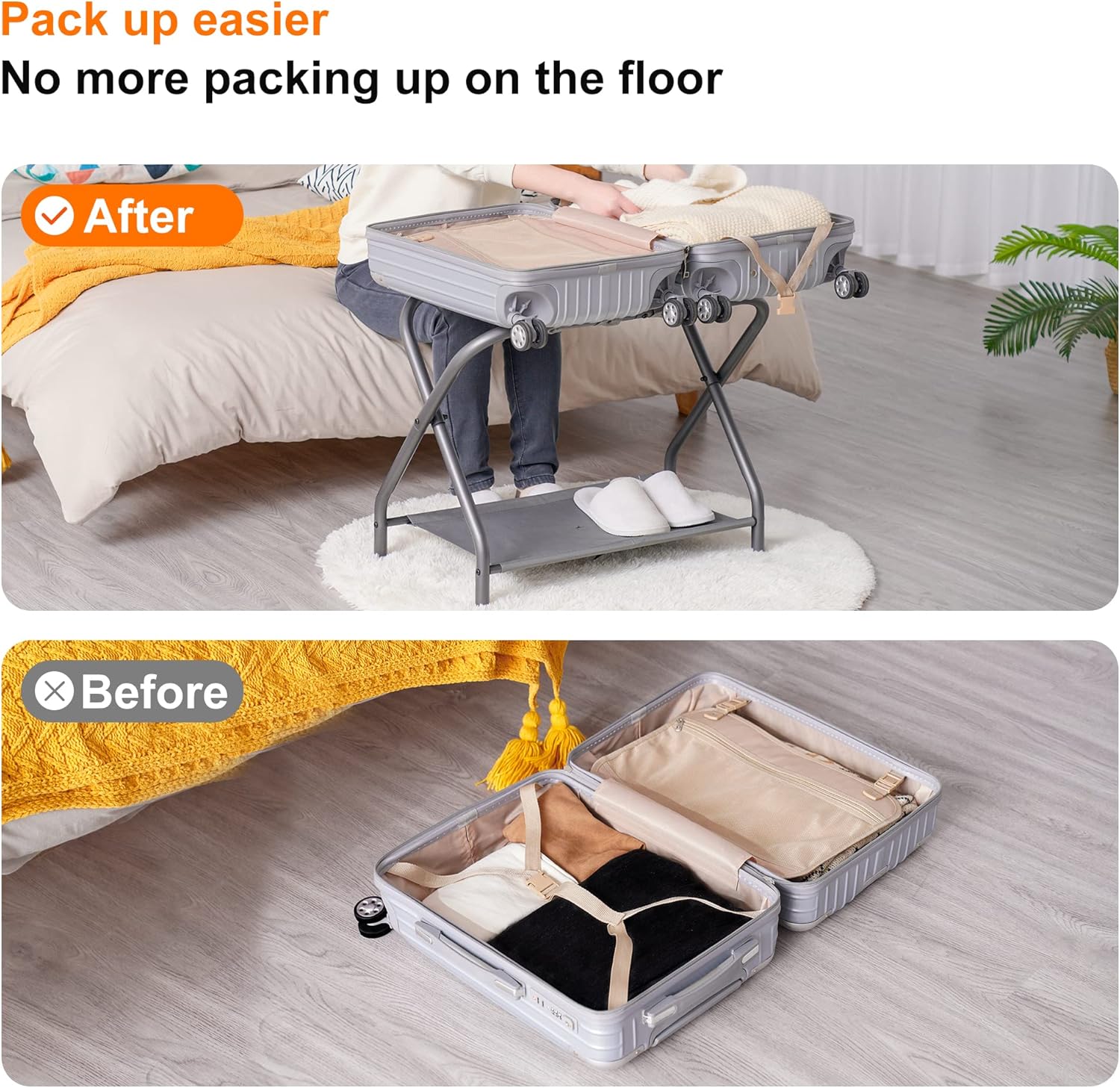 - Awesome addition for guest room: It was sturdy enough to hold a huge suitcase. Having the extra shelf allows storage for a tote bag or Shoes. The racks are very lightweight and fold up for easy, compact storage.