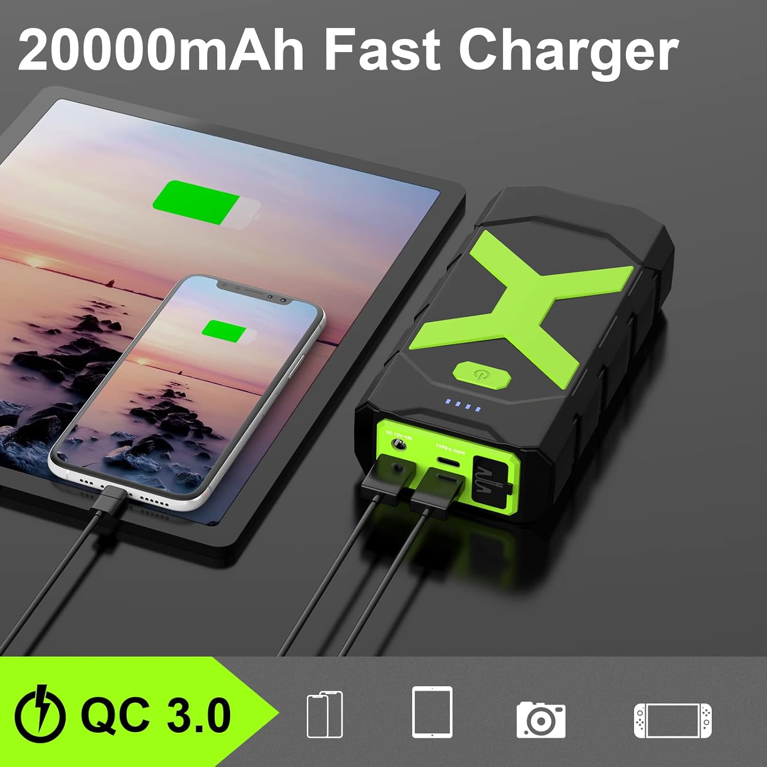 - 【LONG LASTING & LARGE CAPACITY】This A9 jumpstart was used a premium lithium-ion battery pack, 20000 mAh large capacity battery backup can start dead battery over 30 times and recharge your iPhone 4x, watch 10x, headphones 15x, suitable for more on-the-go devices; 18W Type-C input and QC 3.0 output allow you to power them up any time any where