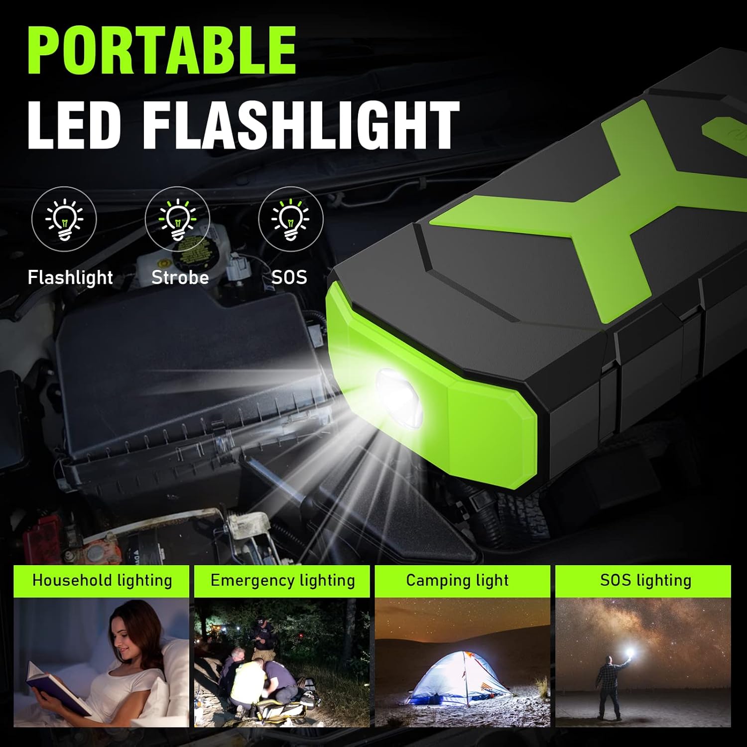 - 【MULTI FUNCATION JUMP BOX】 - Not just a jump box, it has 3 LED lights modes: Flash Light, Strobe Light, and SOS Light. This multi-purpose flashlight comes in handy in case of picnic, travel, emergency and outdoor adventures; 400 LM 5W LED can work more than 10 hours,weather you take it for reading or for help