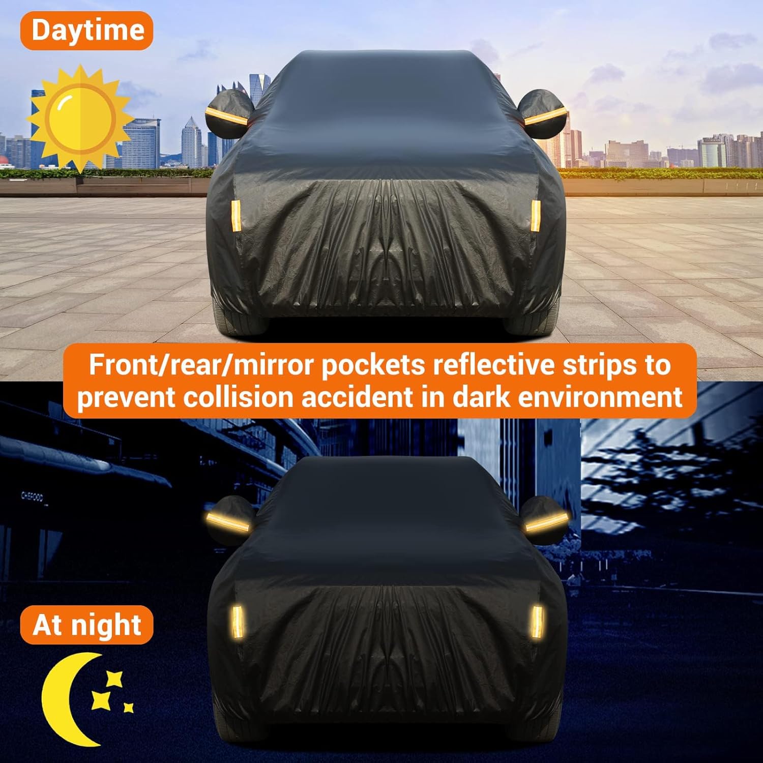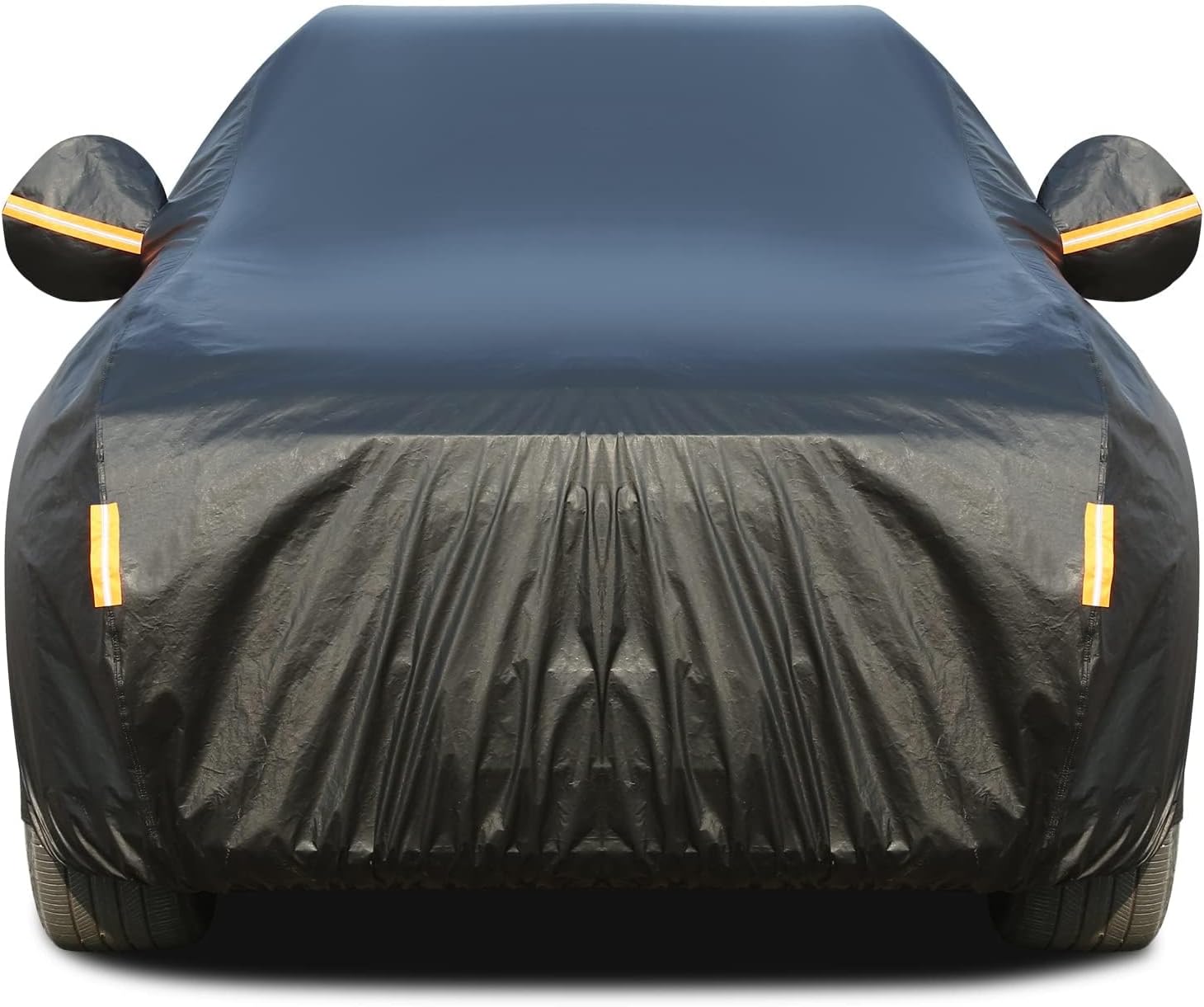 - Unique Design: DRIVER SIDE ZIPPER FOR EASY ACCESS. Front/rear windproof straps + double fixed buckles + Strong elastic hem help the car covers for automobiles stay secure and resist strong winds. 6 reflective strips alert others at night, professional mirror bag design. Precise and durable double stitched weatherproof full outdoor car cover is more abrasion and tear resistant.