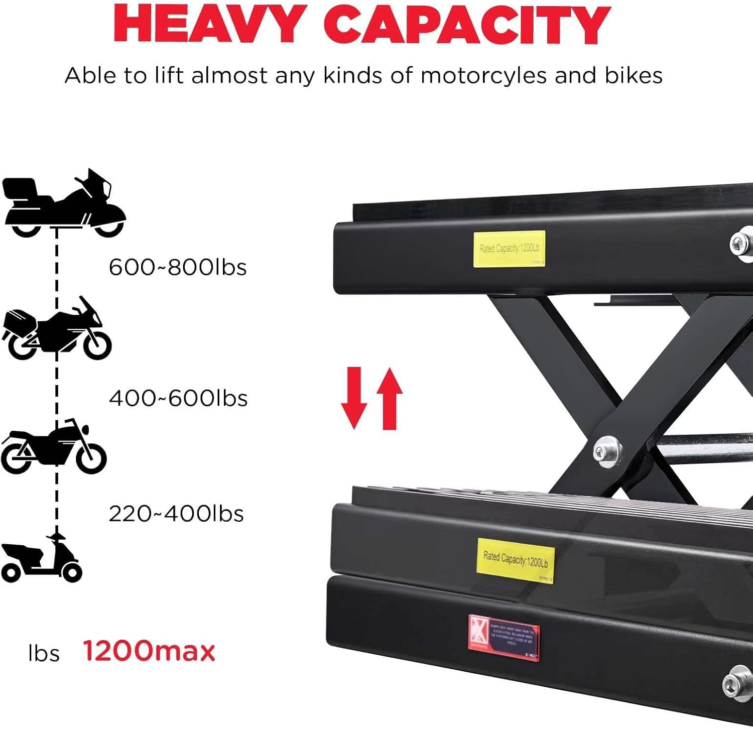 - Solid Iron Structure : Our motorcycle lift jack is made of heavy-duty Iron ,it's strong and durable,With a max load capacity of 1200 lbs,which is very powerful,also with high quality black electrophoretic finish