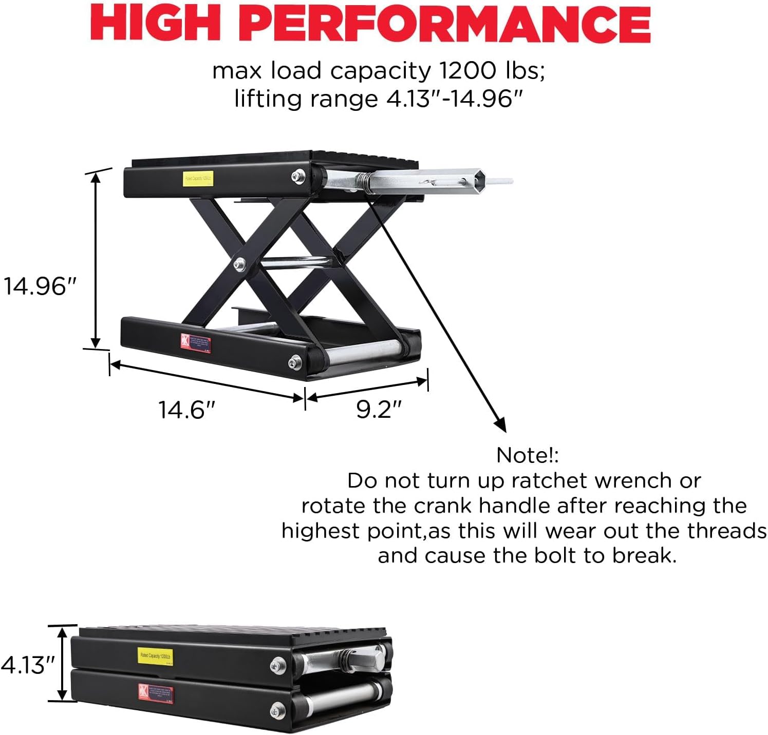 - 4.13"-14.96" Lifting Height : This motorcycle lift jack has a lifting height range of from 4.13" to 14.96".With a max load capacity of 1200 lbs,it can lift most motorcycles,snowmobiles,ATVs,UTVs,street bikes,etc.It's suitable for use in multiple locations such as repair shops,garages and race tracks