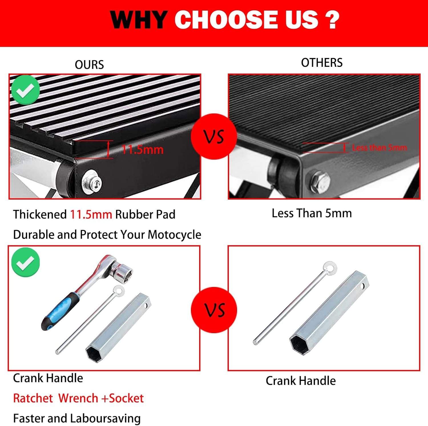 - Equipped with Ratchet Wrench : In addition to the crank handle,we also have an extra ratchet wrench,which is easier to use than crank handle,you will spend less effort to lift the motorcycle up quickly