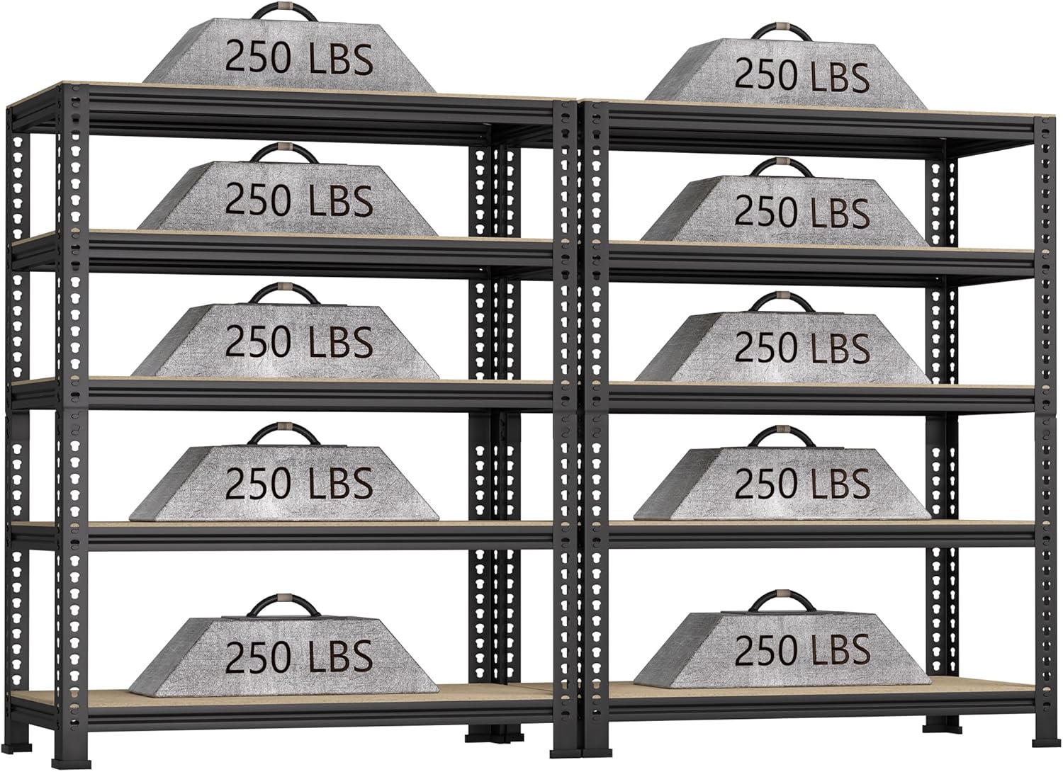 - - Built to Hold More: Featuring a heavy-duty metal frame and premium MDF boards, BuxWellBang garage storage shelves overall size: 28" W x 12" D x 59" H. Max. load capacity is 250 lbs per layer shelf (evenly distributed) without buckling or breaking, 5 tier shelves' total max load capacity is 1250 lbs. The rock-solid construction of storage shelf ensures greater strength, longevity, and stability—a storage rack you can trust for the long haul