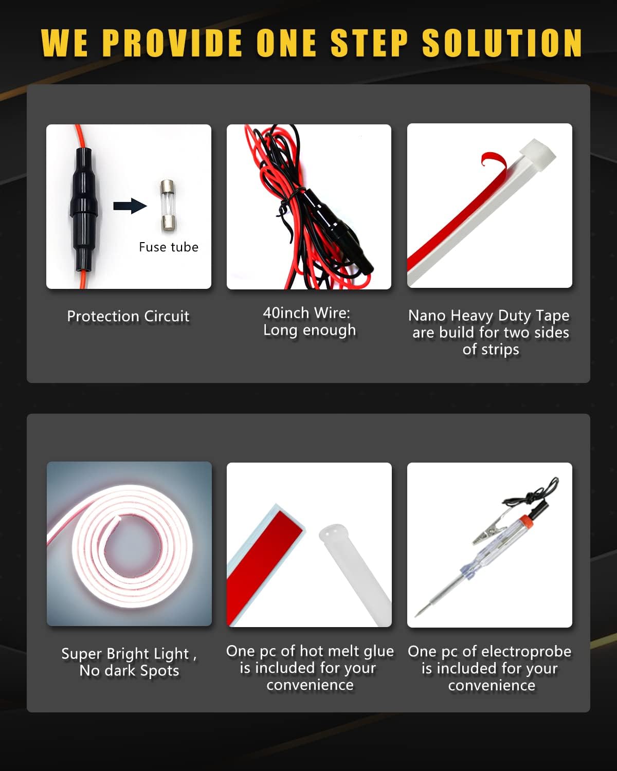 - ăFuse ProtectionăThe Car led strip light is made of soft silicone with heavy duty Nano Tapes on both sides,Super Bright,No dark Spots.Short circuit protection to enhance the safety.