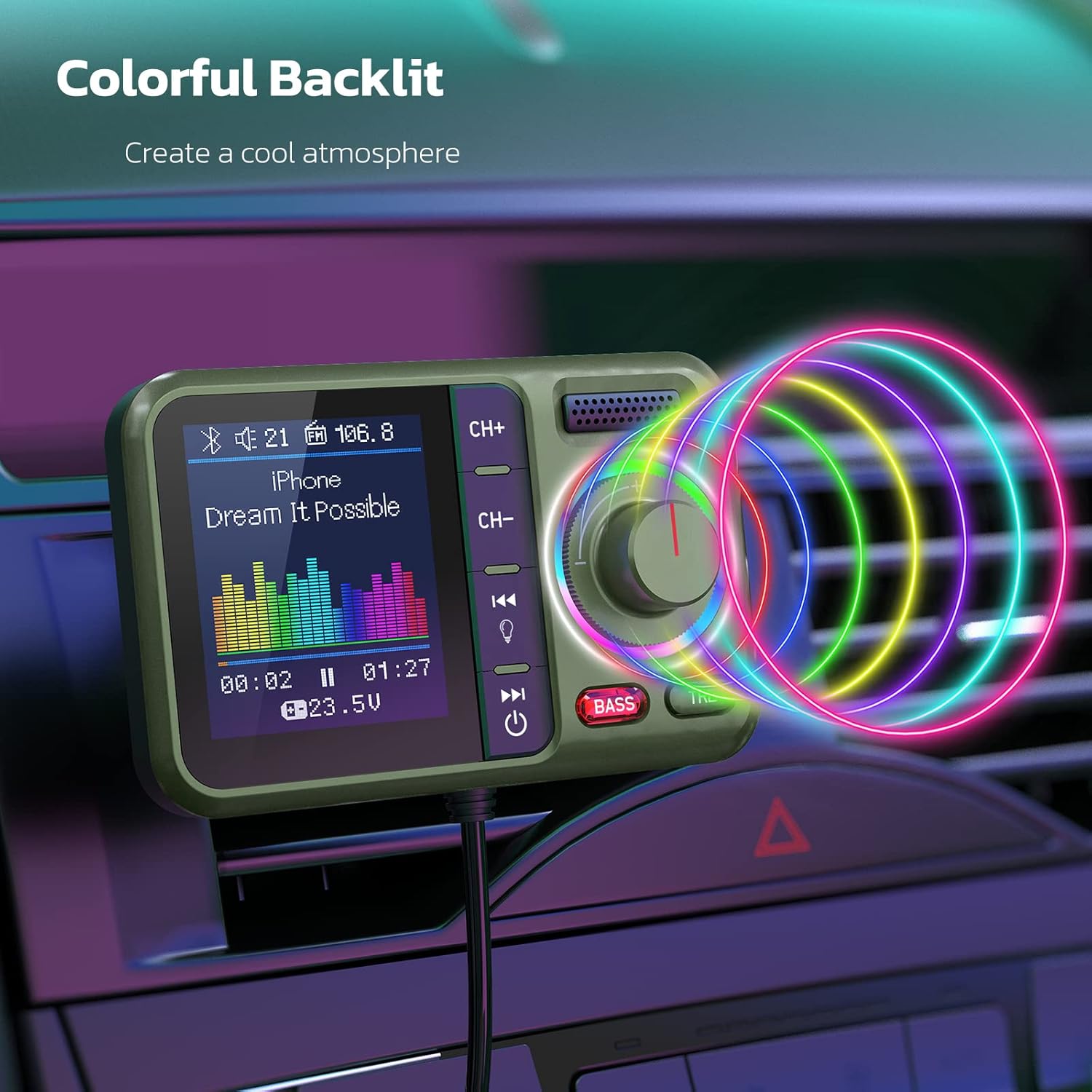 - 8 Colorful LED Backlit Modes: Long press the light button on the fm transmitter bluetooth for car to enter the light change mode, and then spin the knob to adjust to the light mode you want. There are 7 mono color modes plus 1 color-changing mode, choose any mode you like to decorate your space, let it color your car!