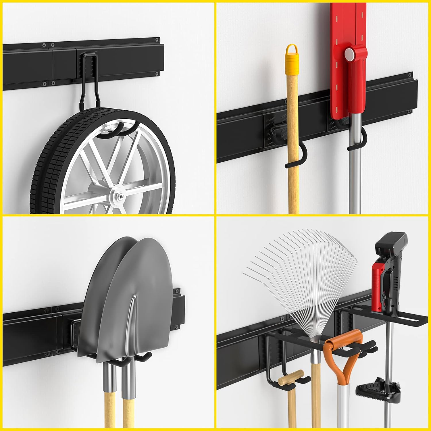 - 【64 inch Multi-function Garage Wall Tool Rack】- Yard tool organizer for garage includes 4 rails and has a 64" long wall track, which can hold multiple tools, such as yard tools, shovels, rakes, brooms, cords, hoses, power tools, hedge trimmers, snow shovels, ski gears and more. All adjustable hooks can snap on the rail and move around on it to meet your actual needs.